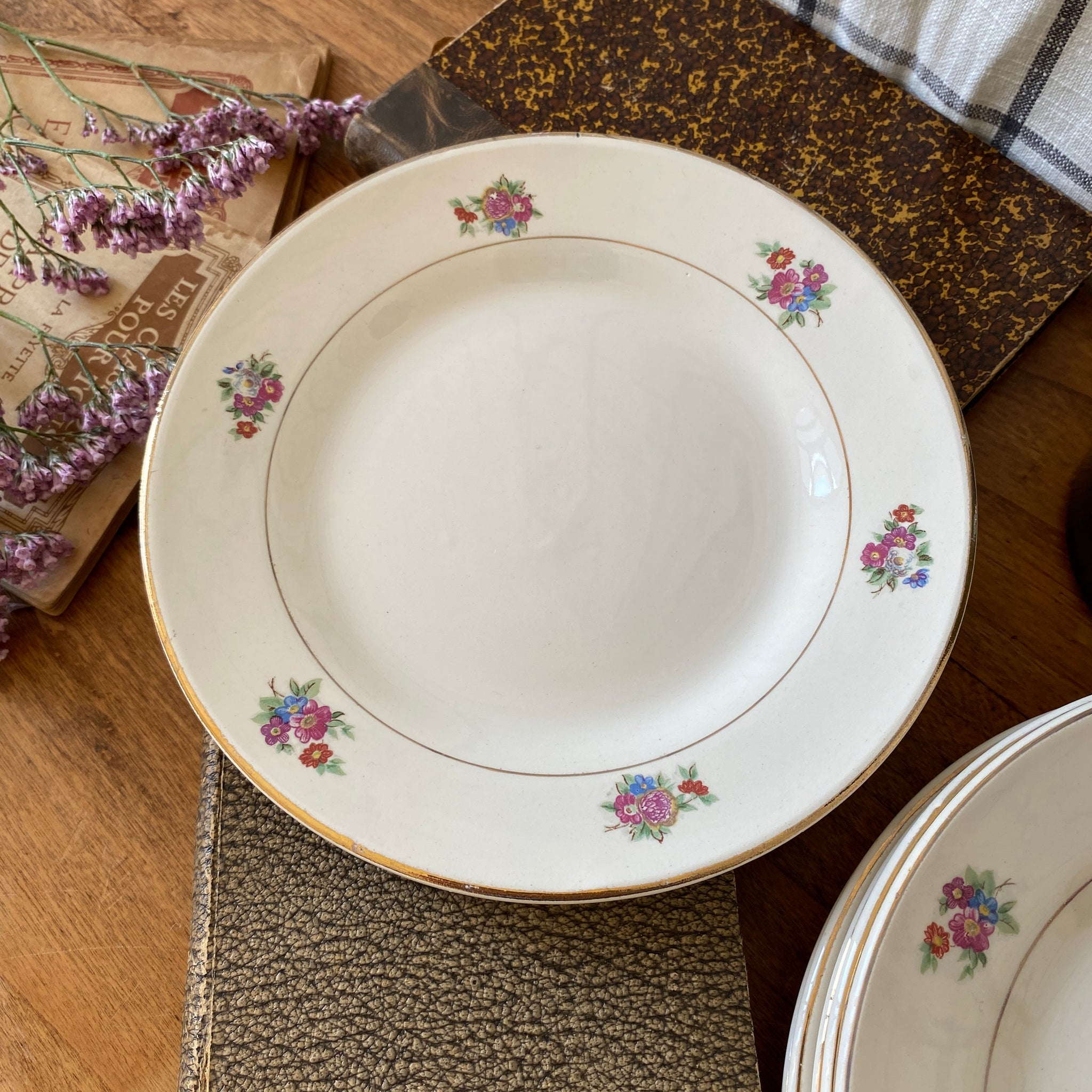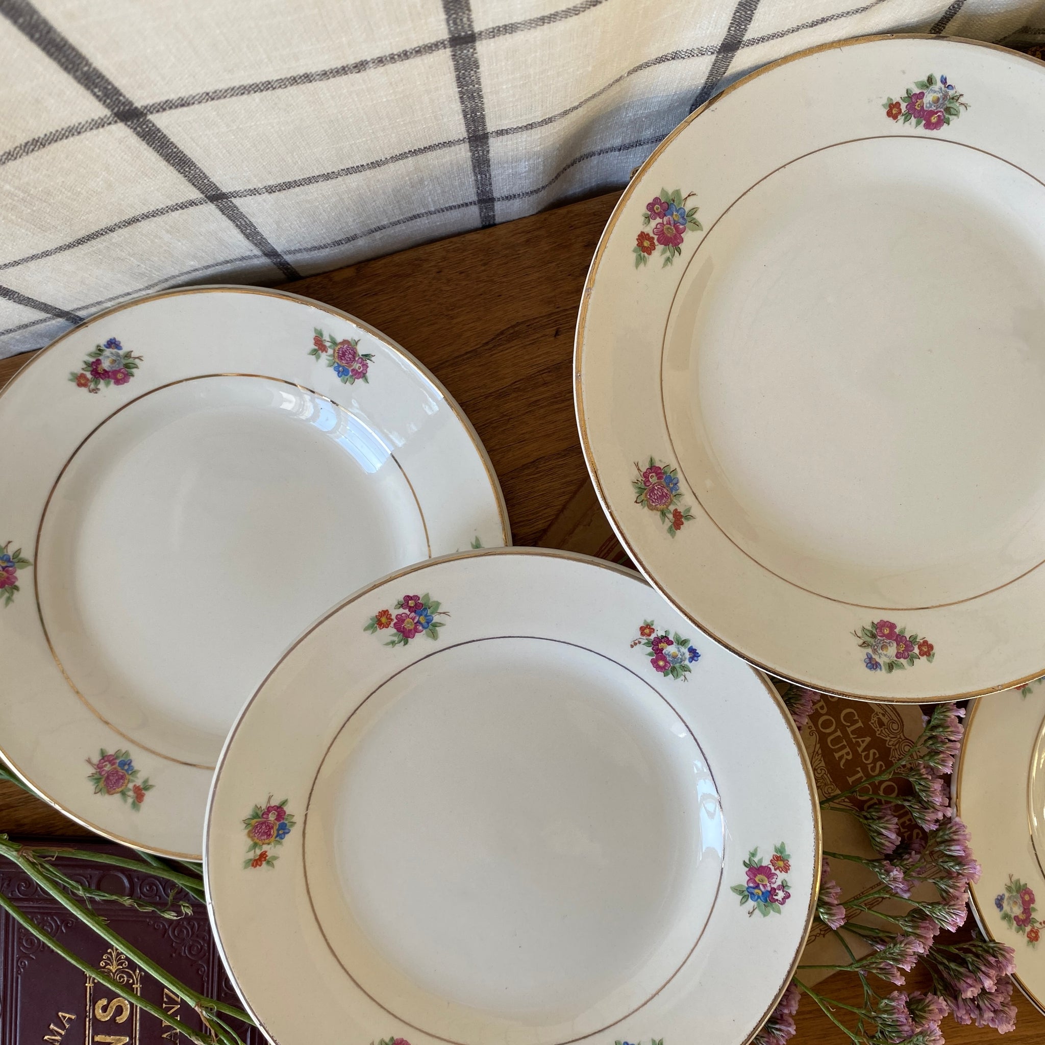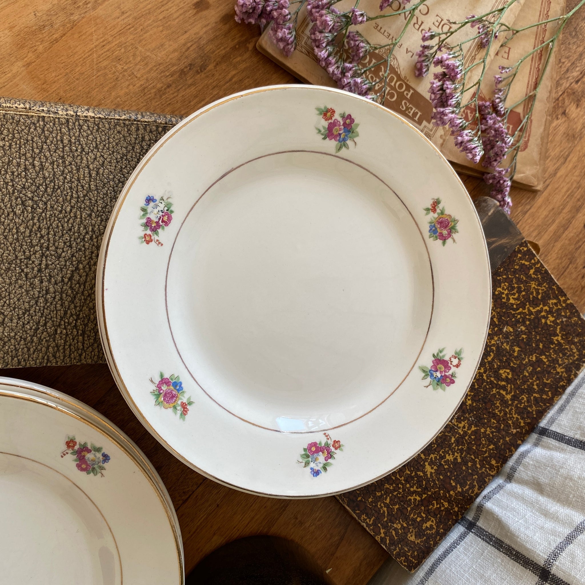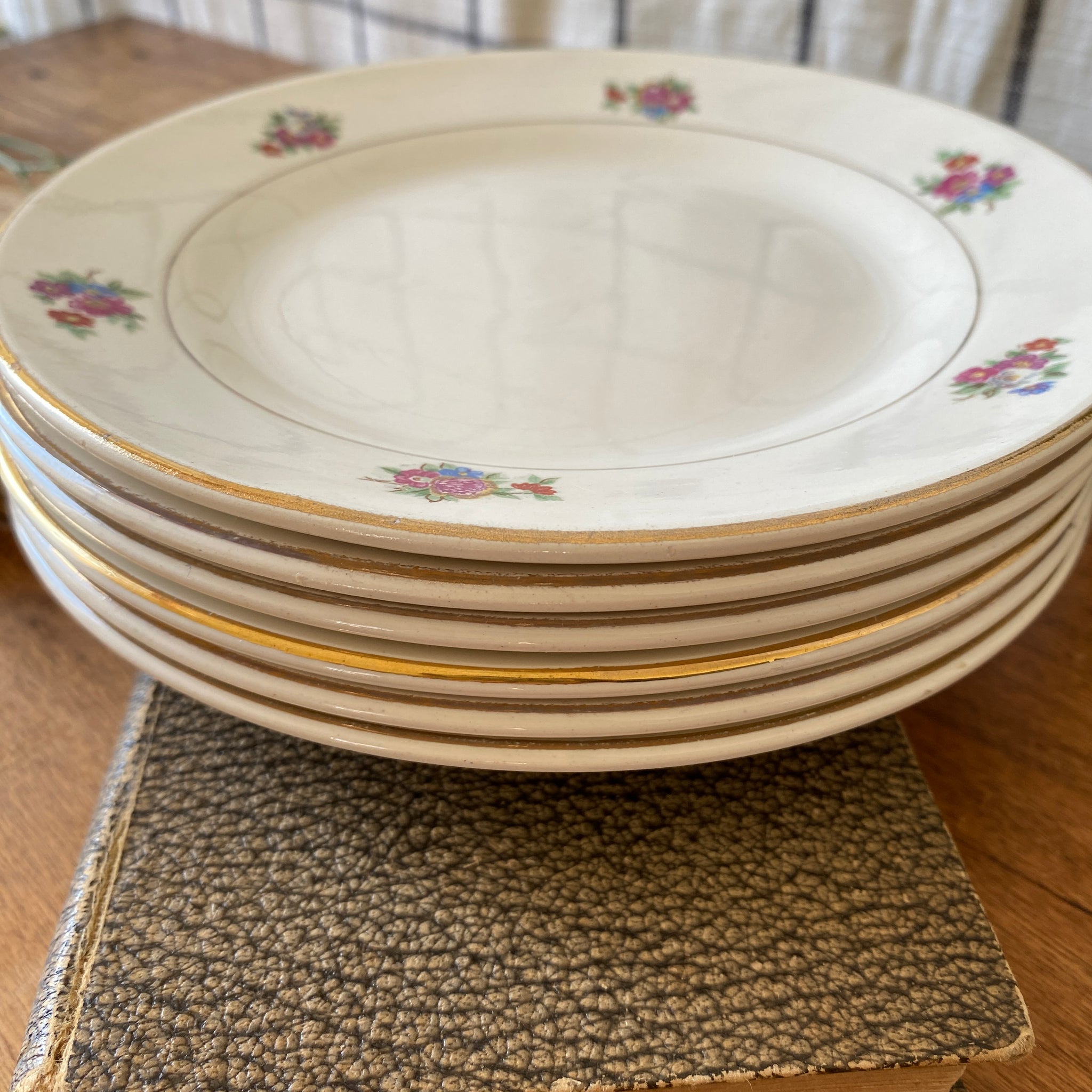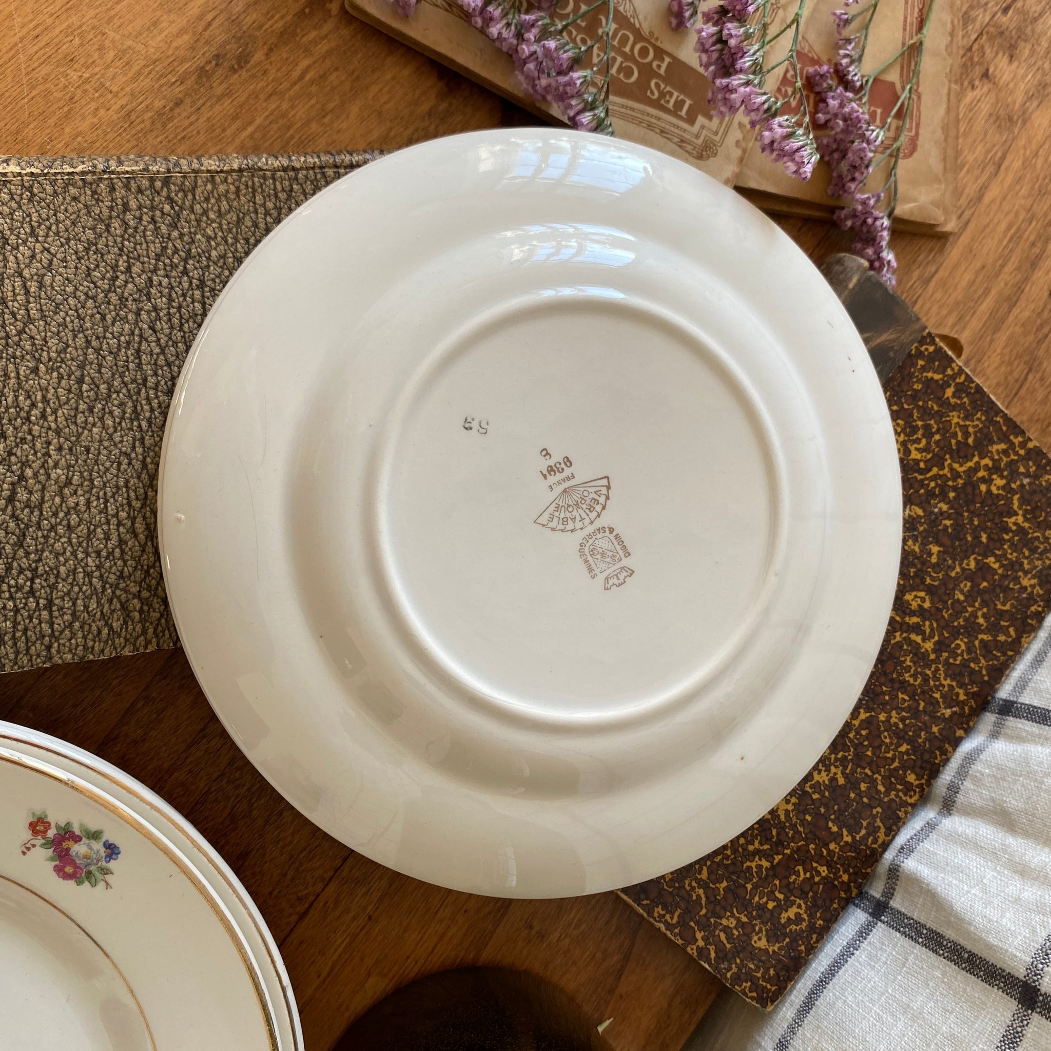 Les assiettes sont en très bel état. Certains liserés dorés et décors fleuris peuvent laisser apparaître quelques micro manques, comme visible sur les photos.