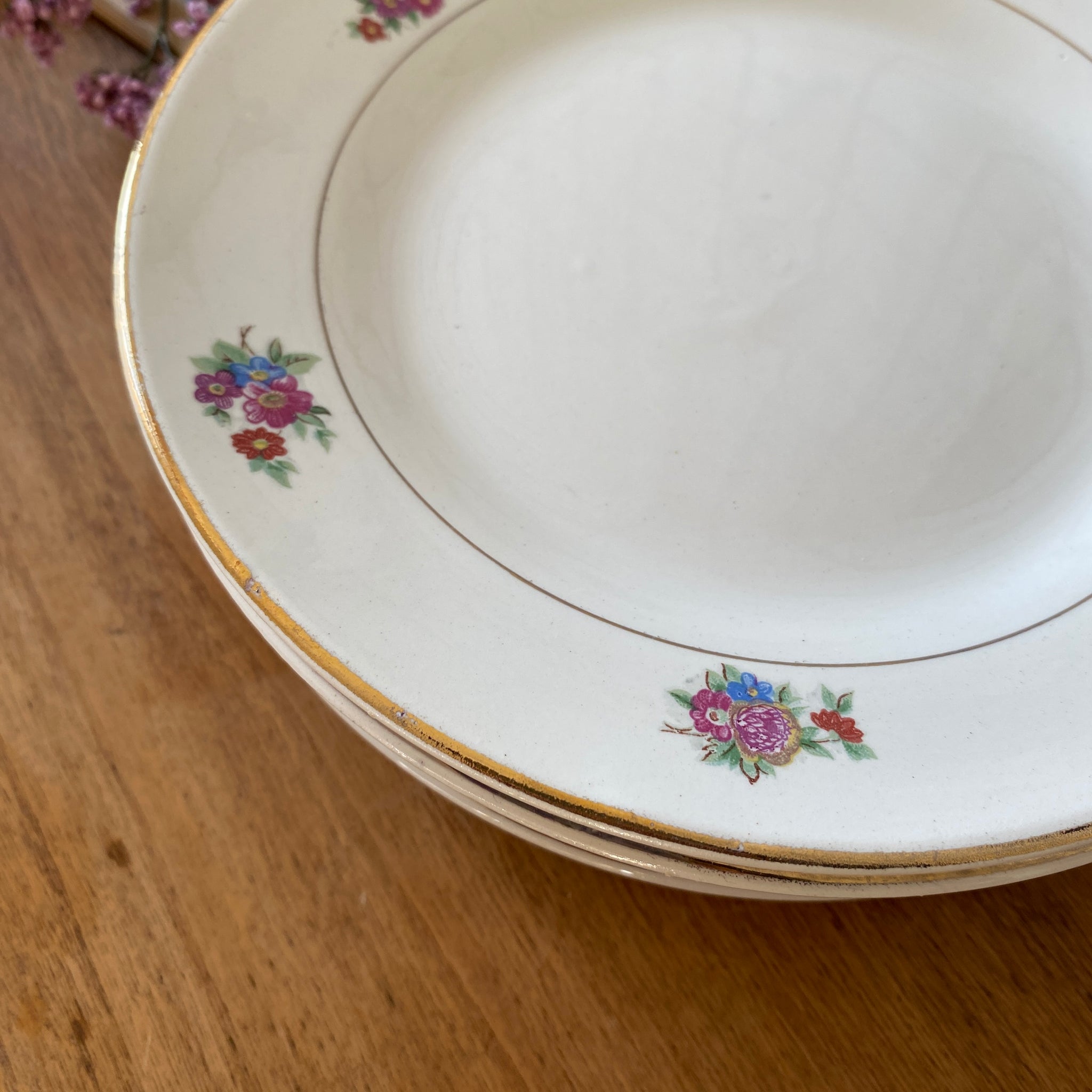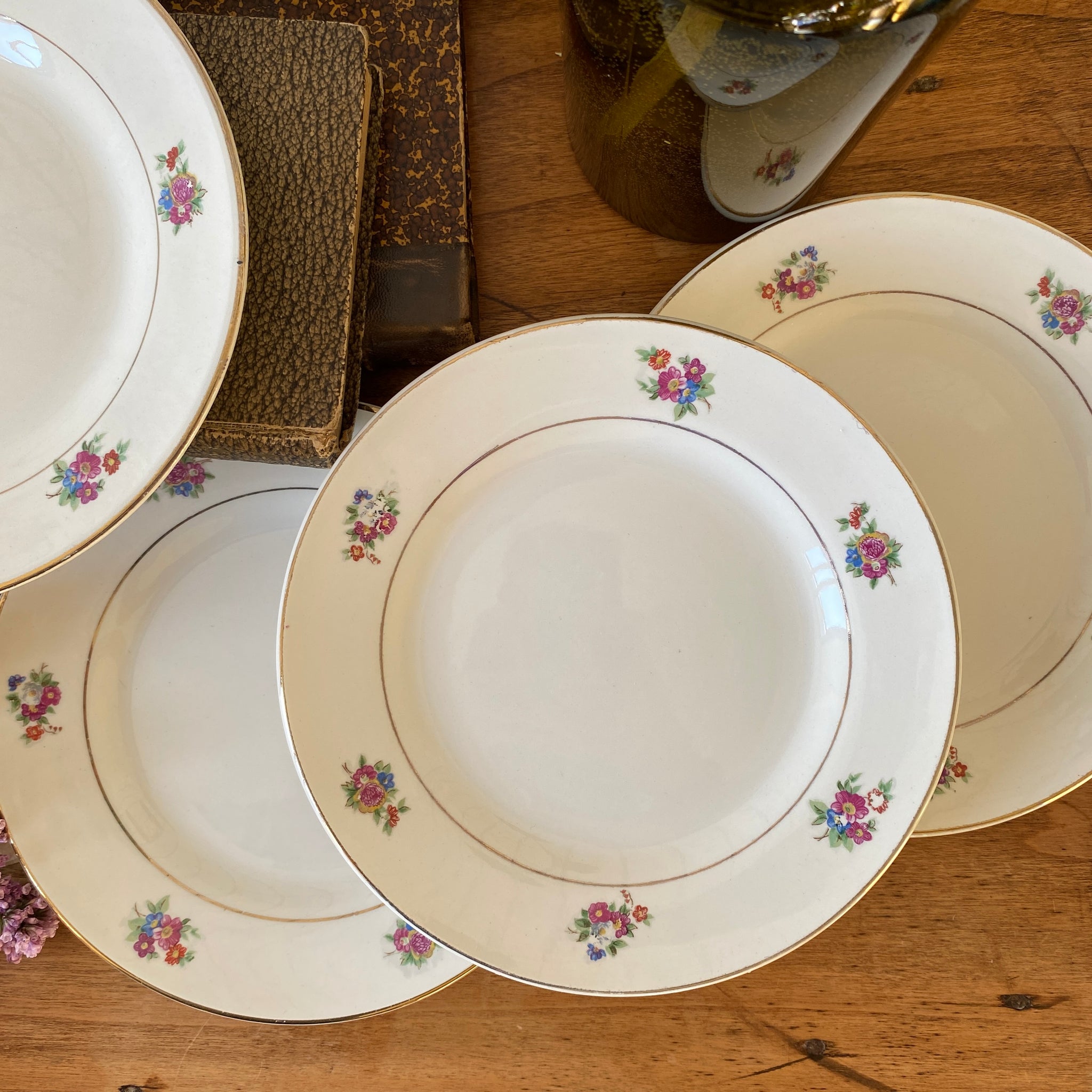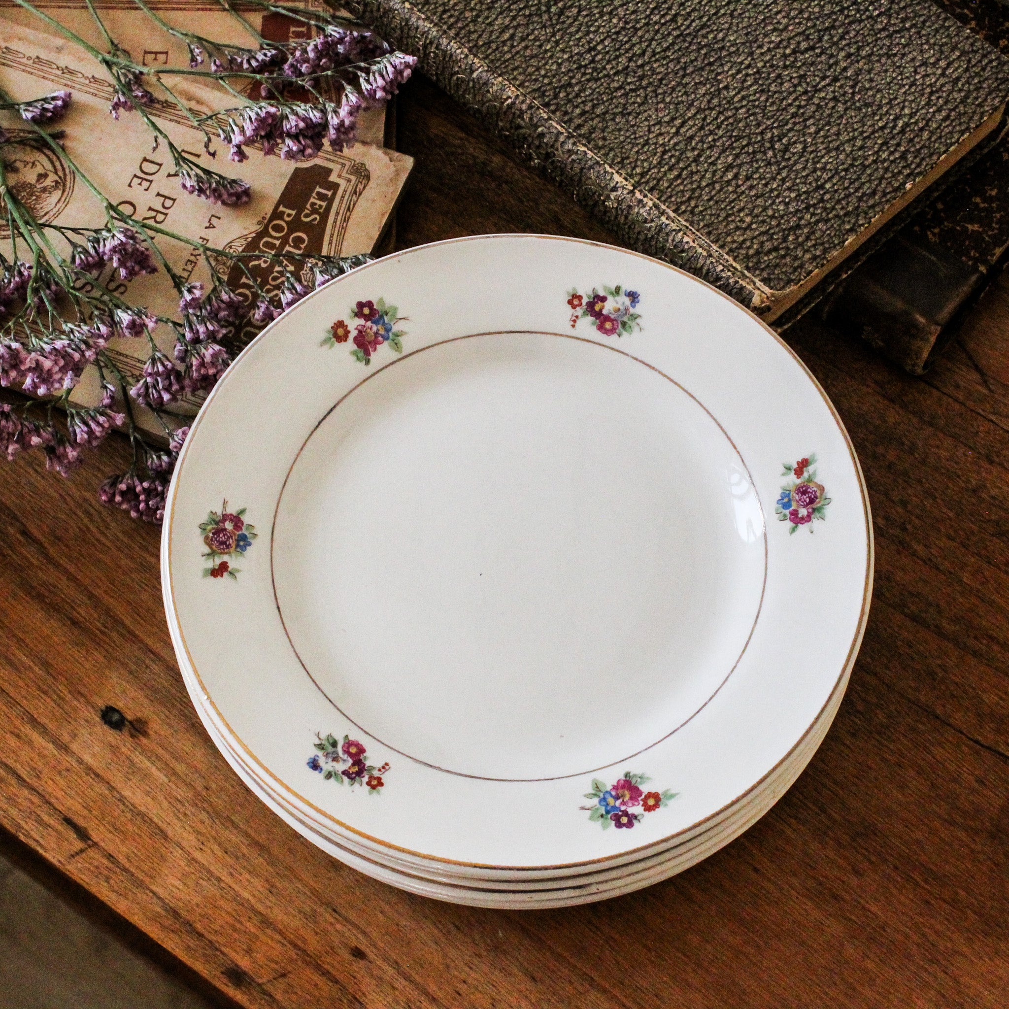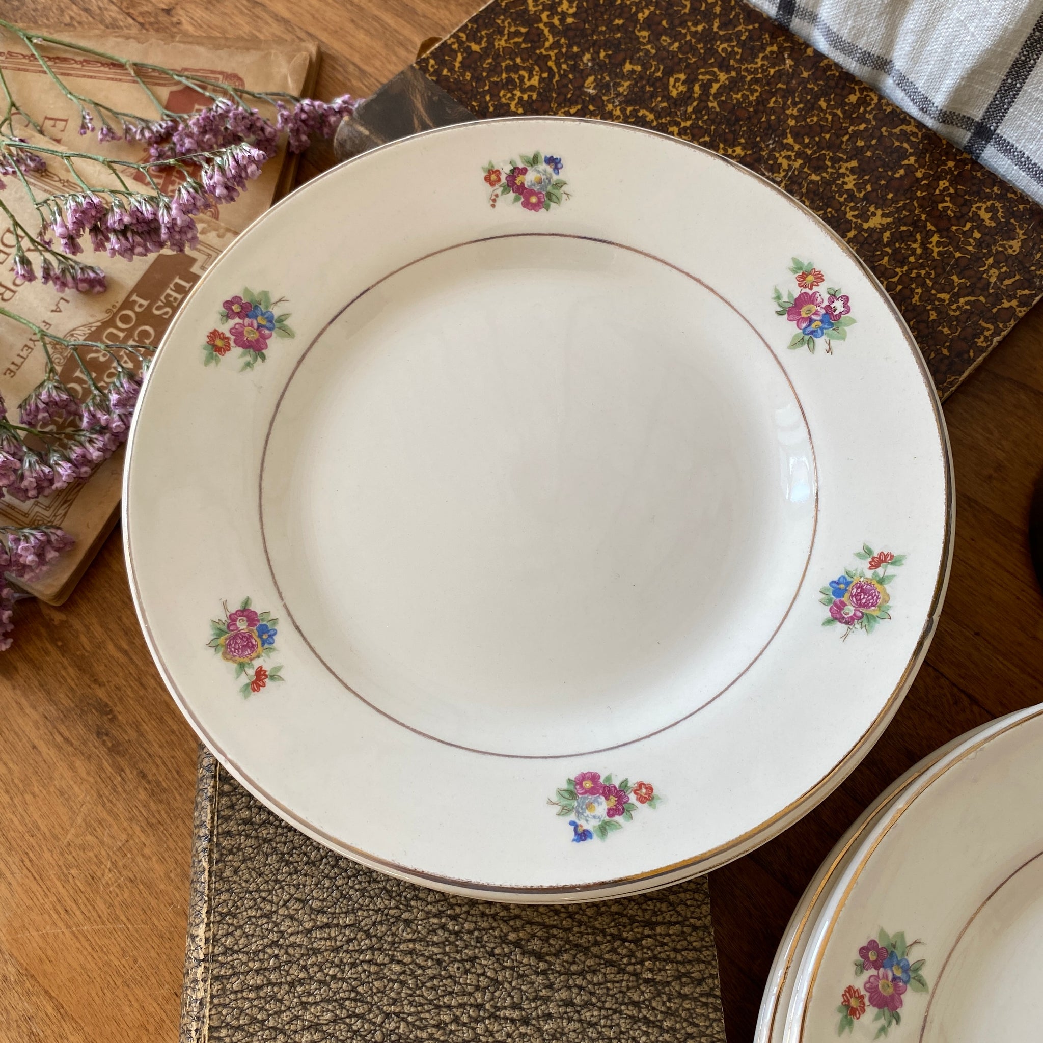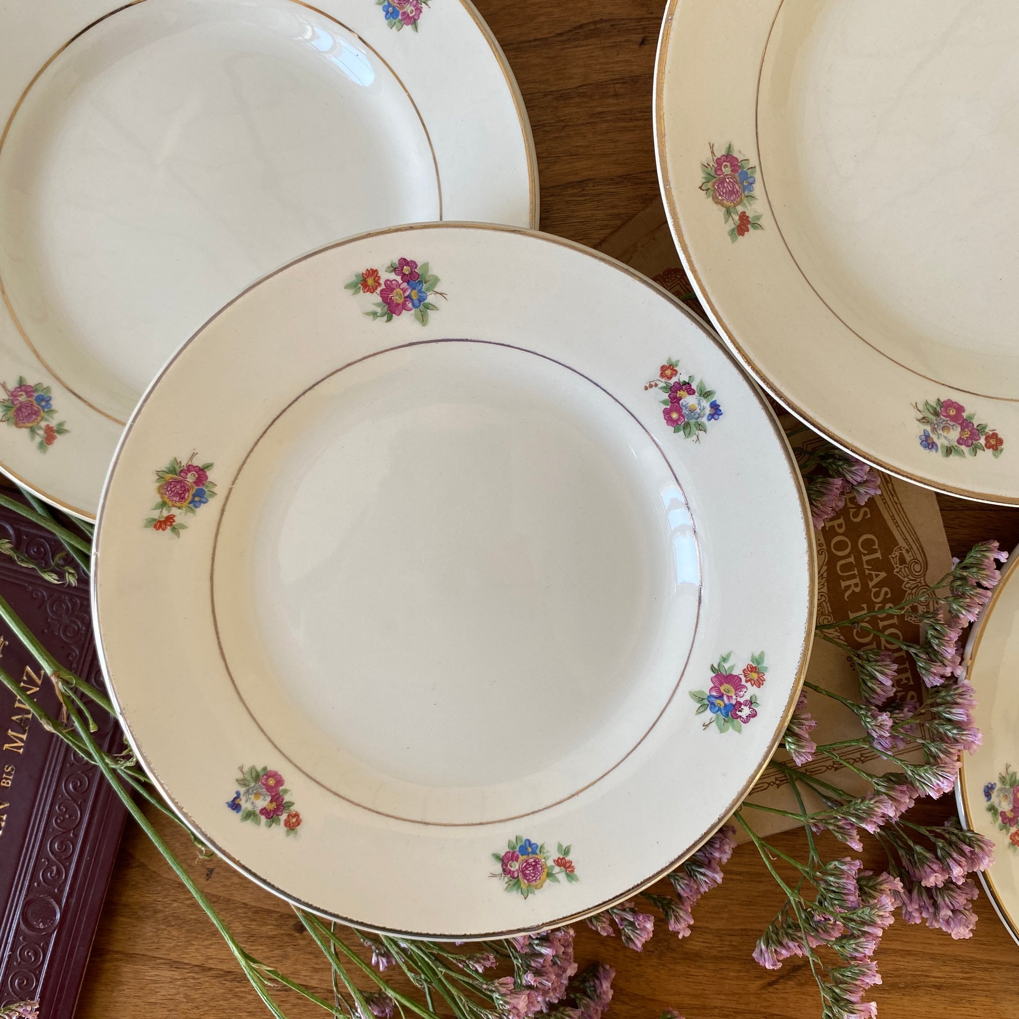 Les assiettes sont en très bel état. Certains liserés dorés et décors fleuris peuvent laisser apparaître quelques micro manques, comme visible sur les photos.