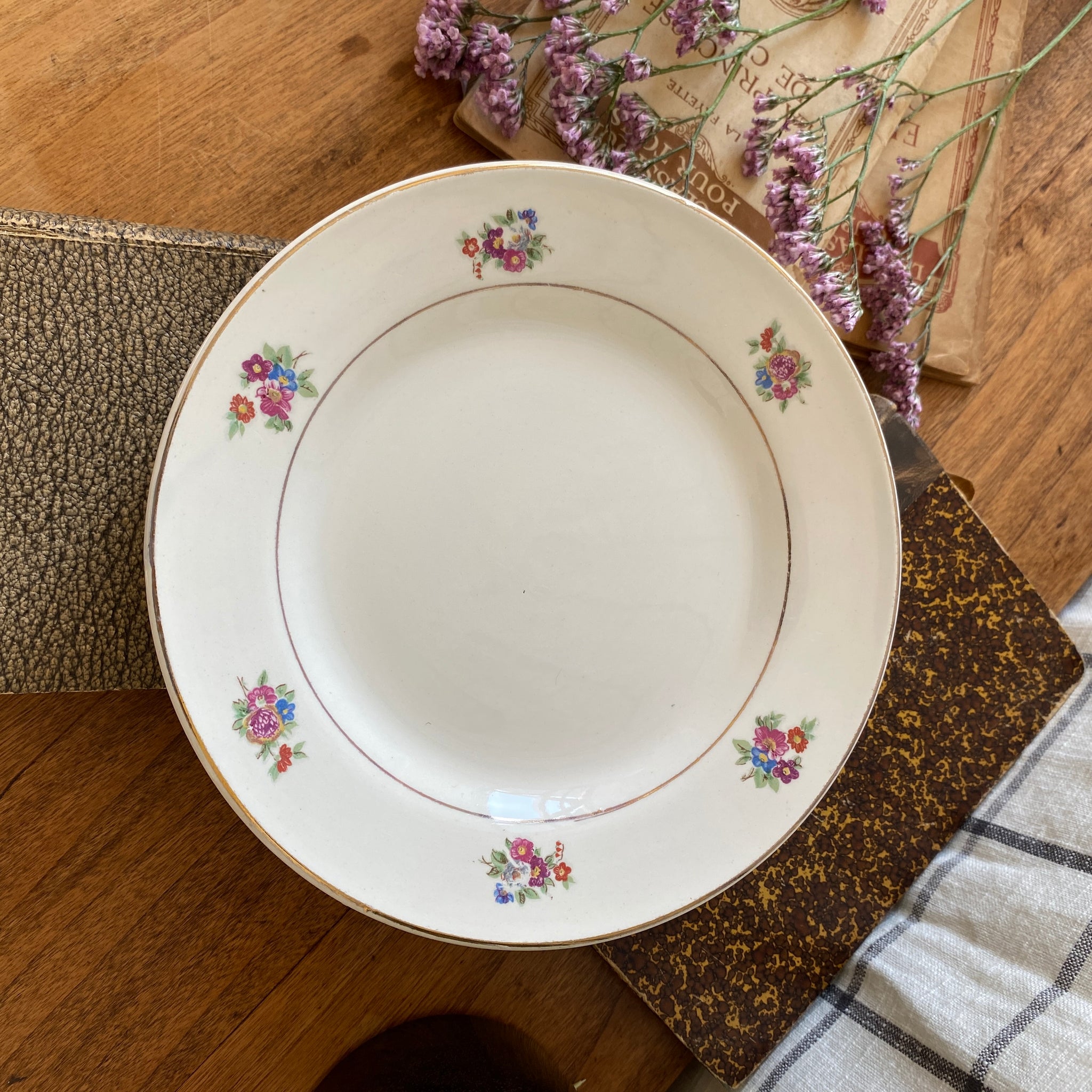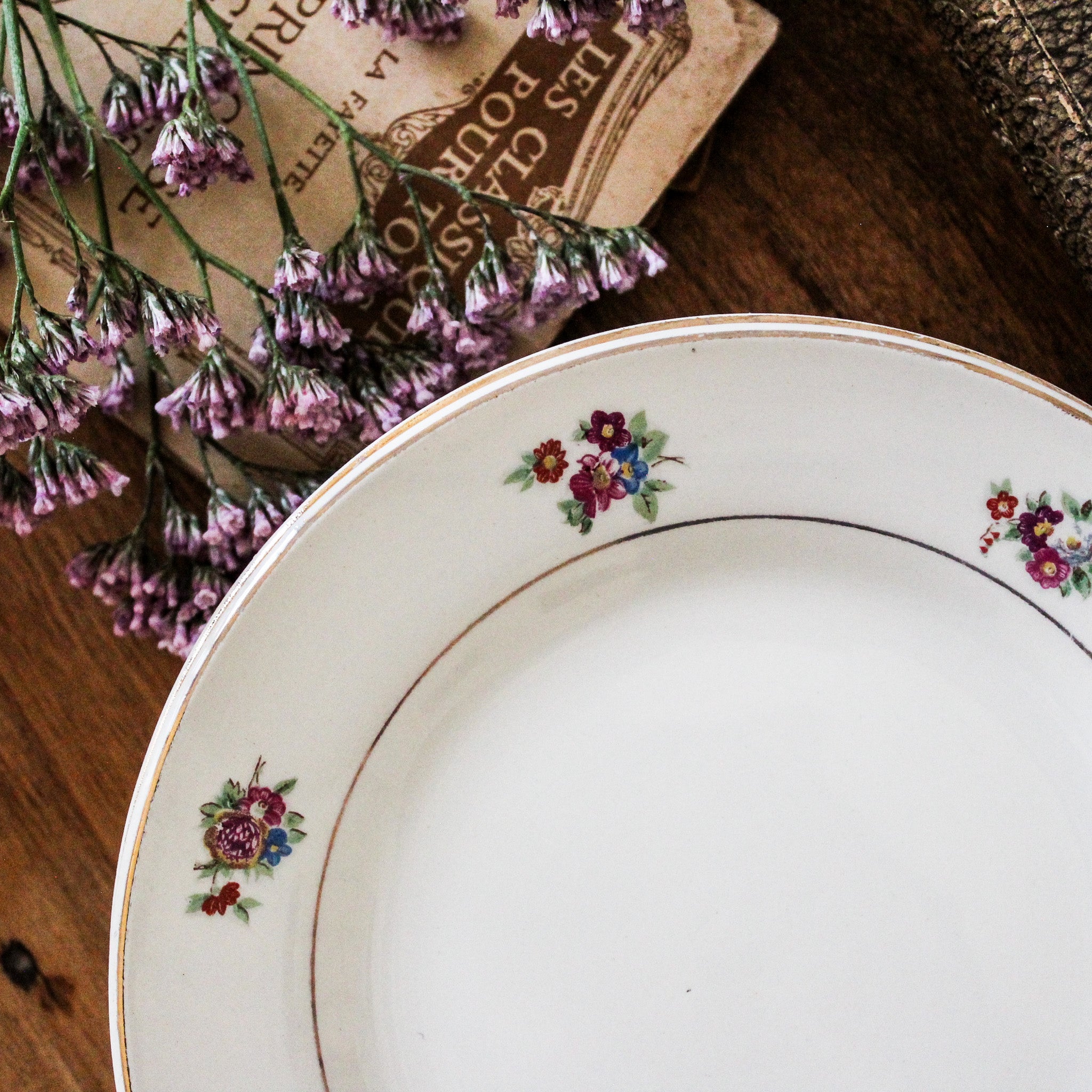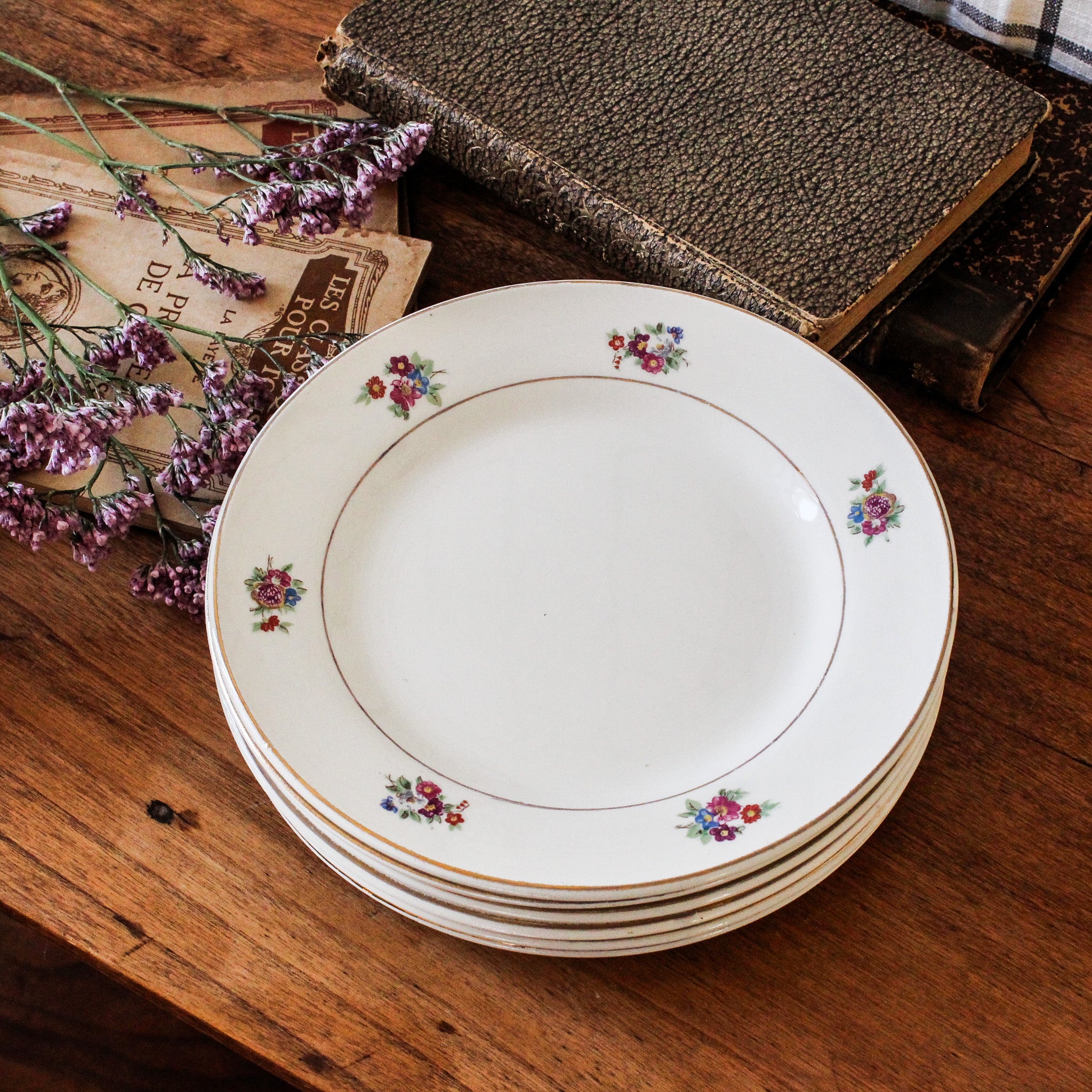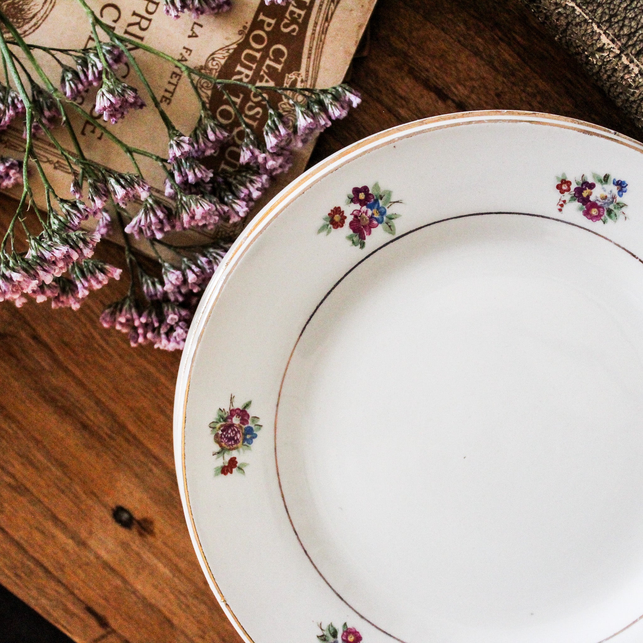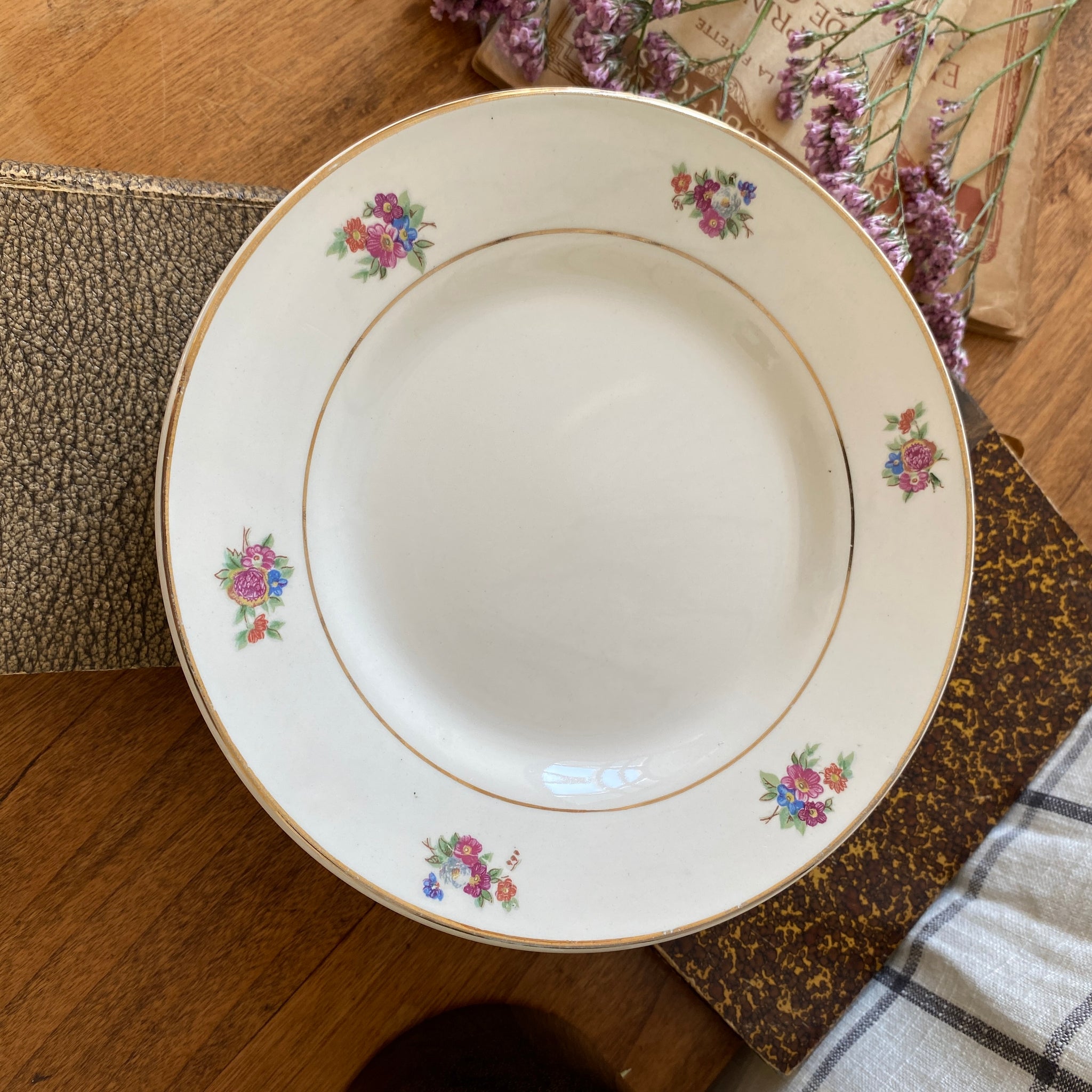 Les assiettes sont en très bel état. Certains liserés dorés et décors fleuris peuvent laisser apparaître quelques micro manques, comme visible sur les photos.