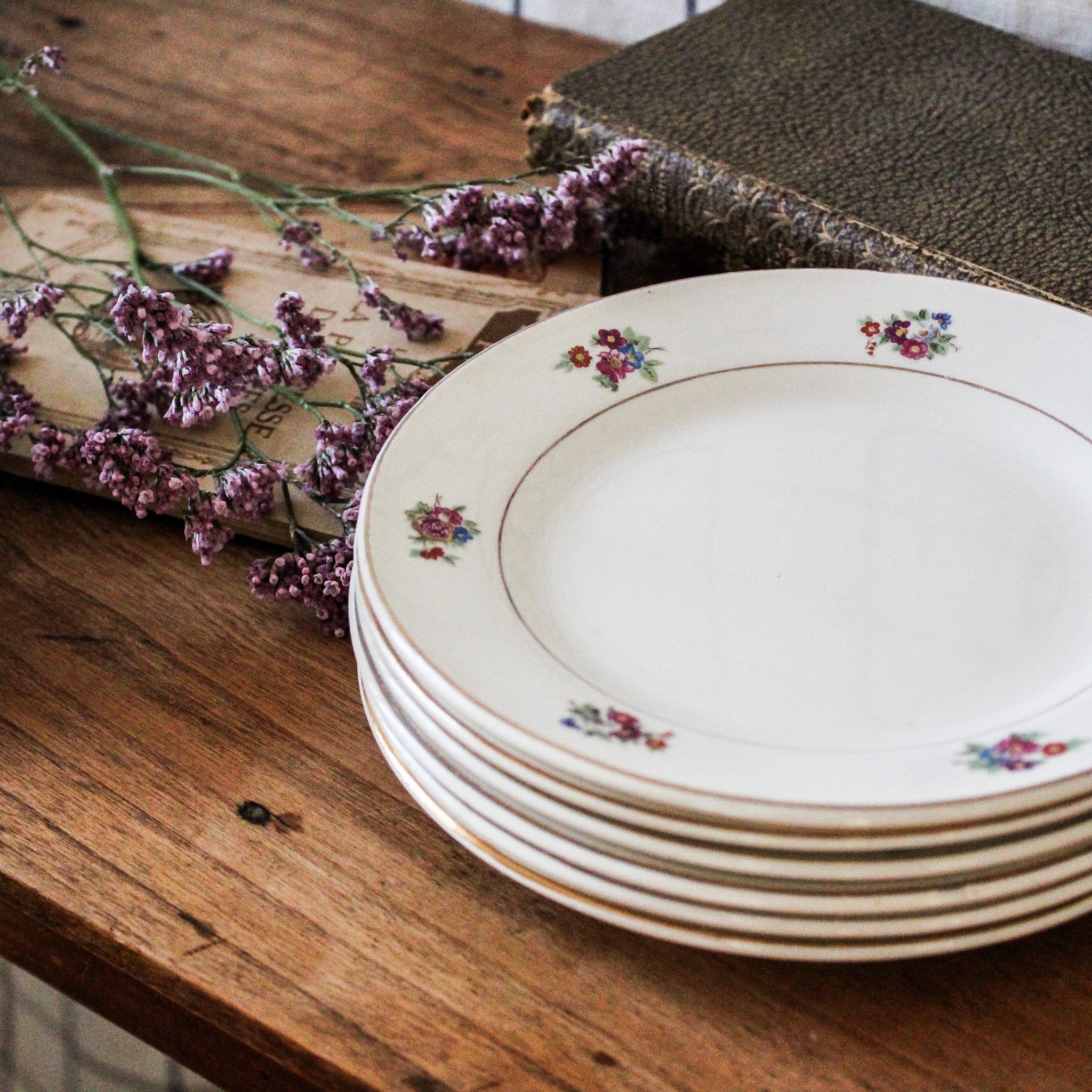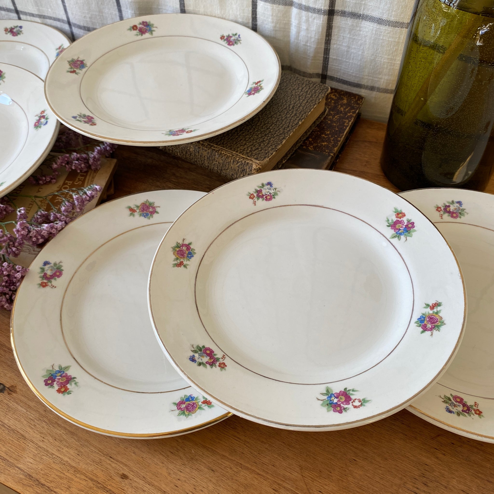 Ensemble de 6 assiettes à dessert vintage, véritable opaque, Digoin & Sarreguemines. Décor fleuri et liserés dorés.