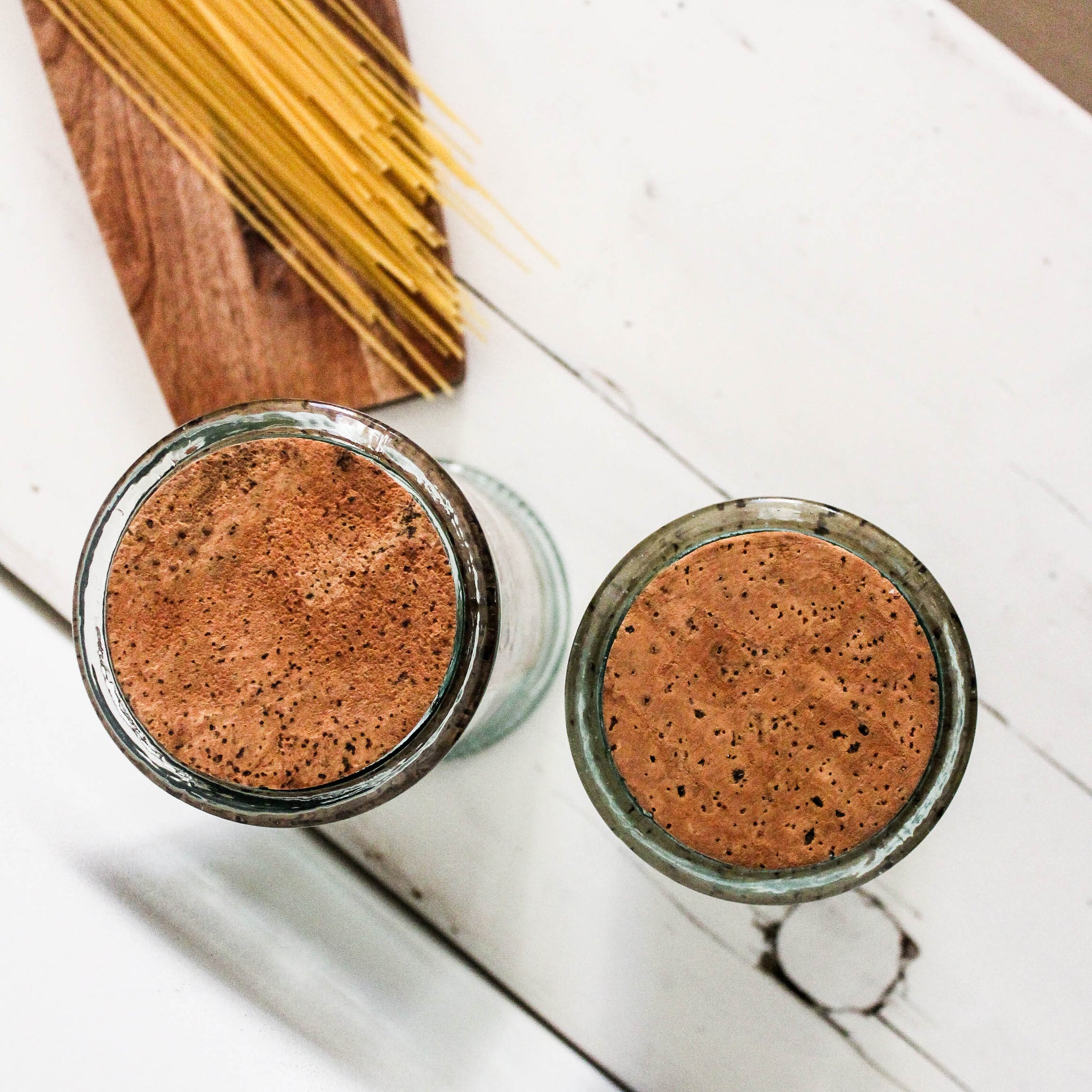 Duo de grands bocaux vintage en verre avec décors publicitaires imprimés et bouchon en liège, composé de :