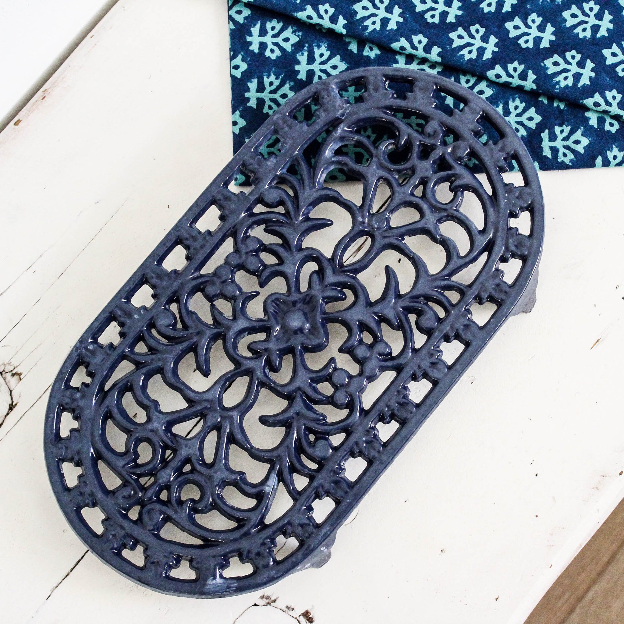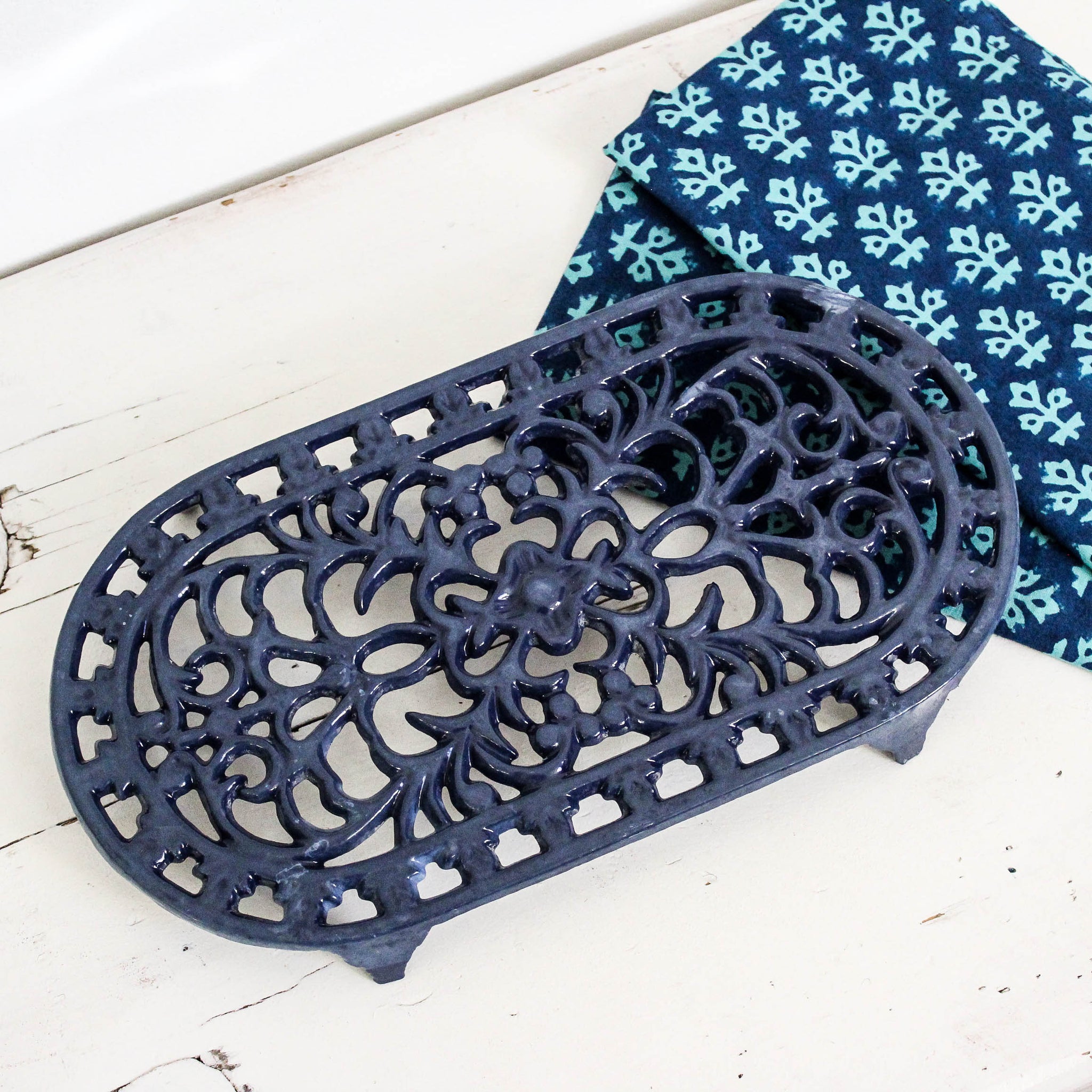 Dessous de plat en fonte bleu vintage, détails symétriques fleuris.