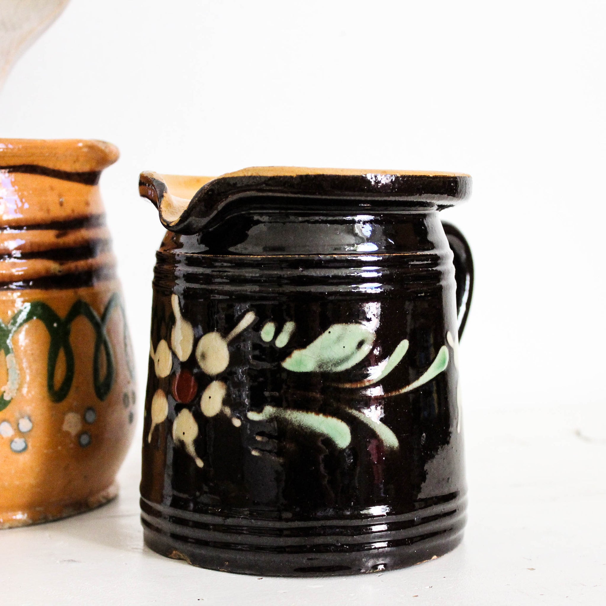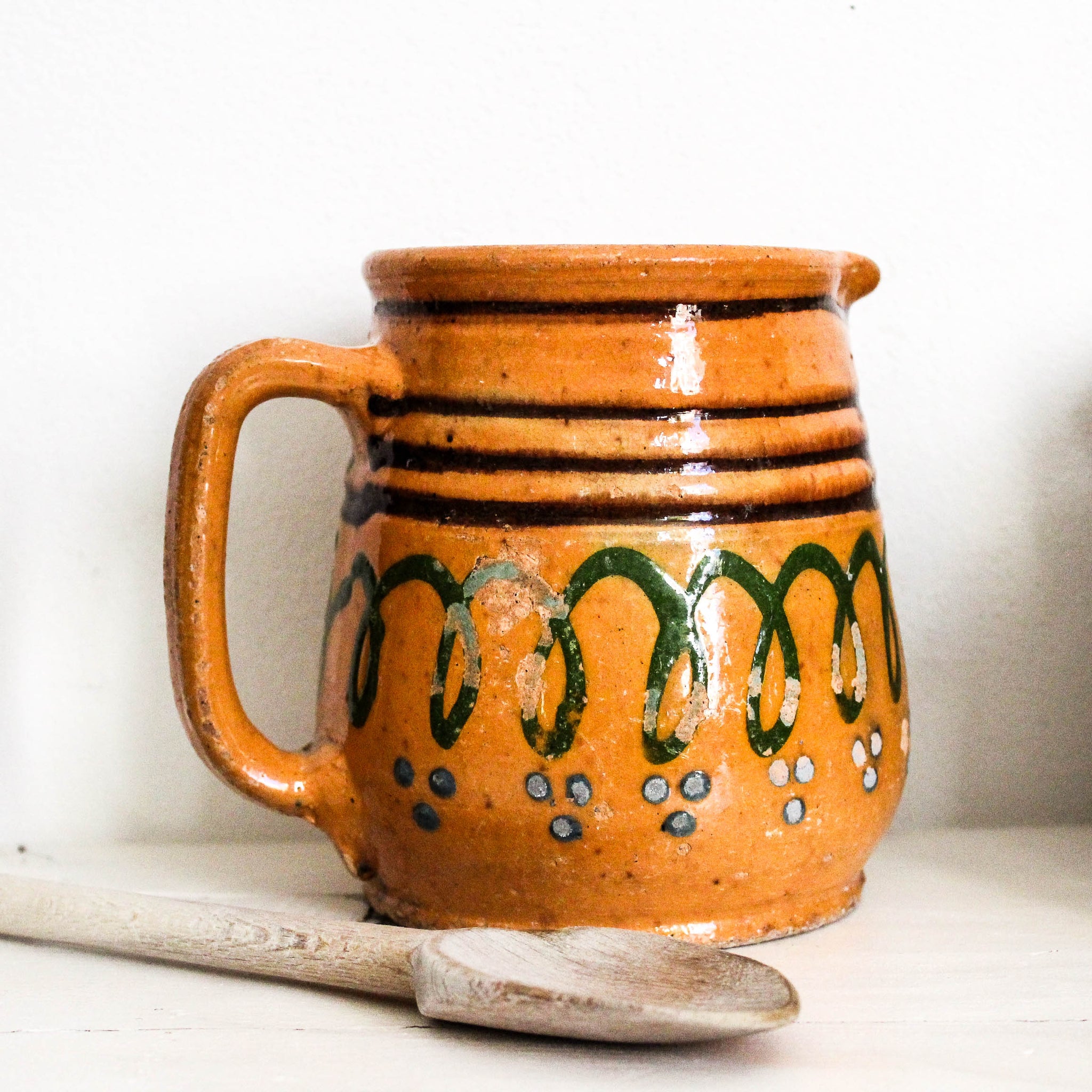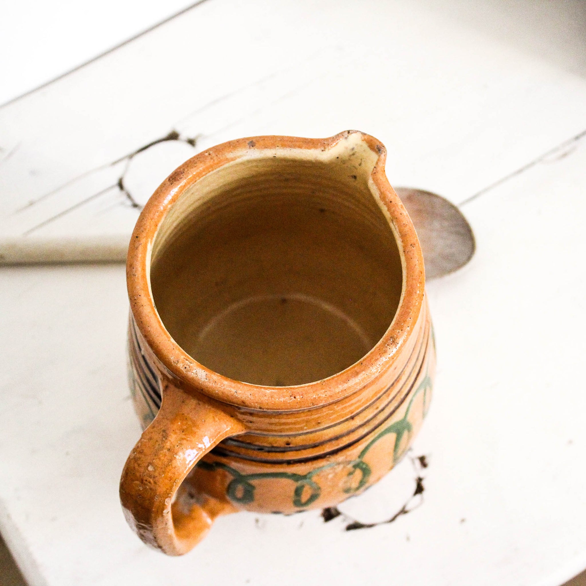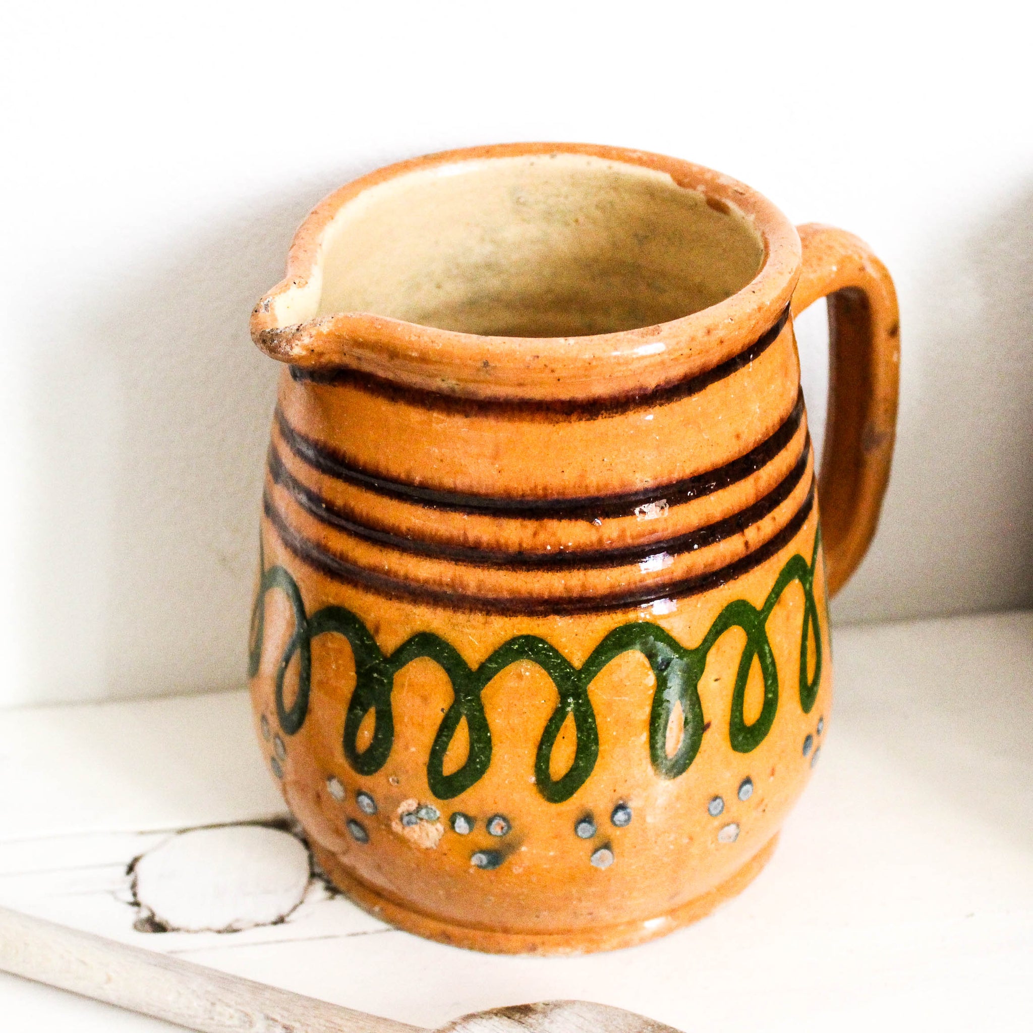 - Pichet coloré, tonalités orangées et décor vert. Belle patine ancienne et bel état global - 15x12cm | 22€