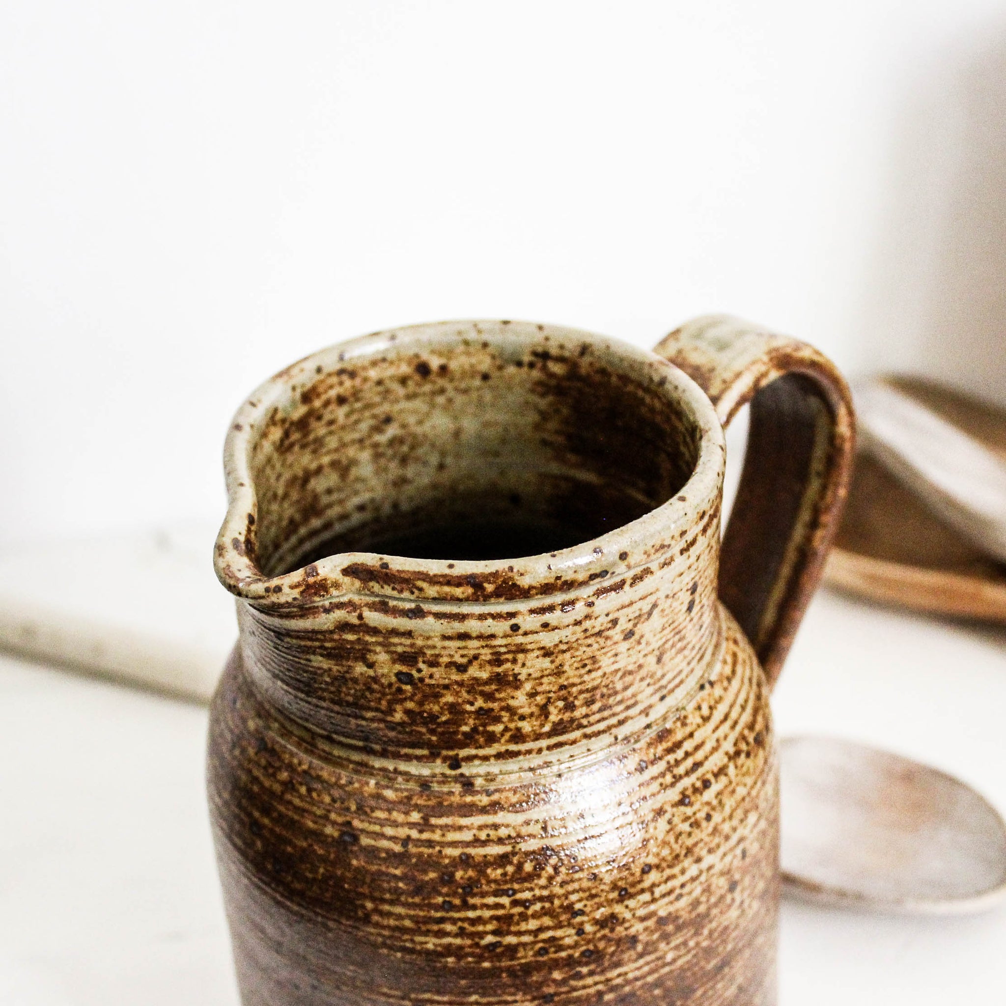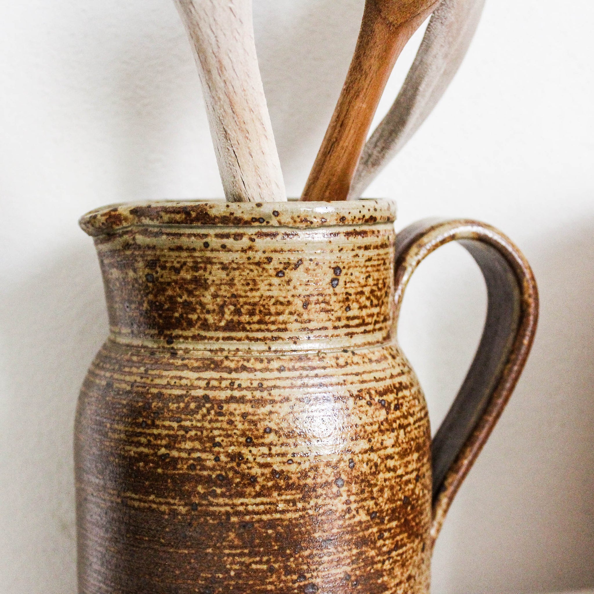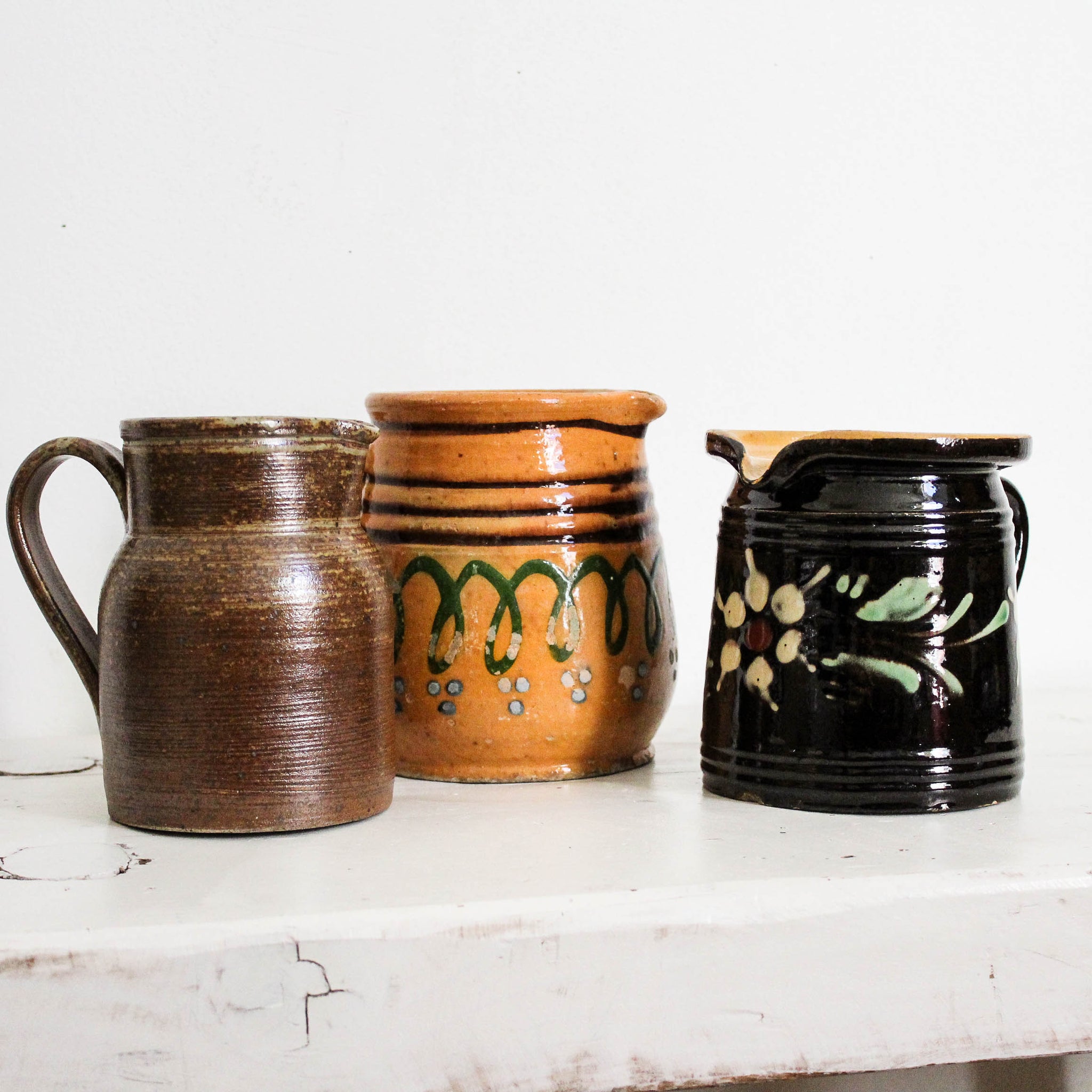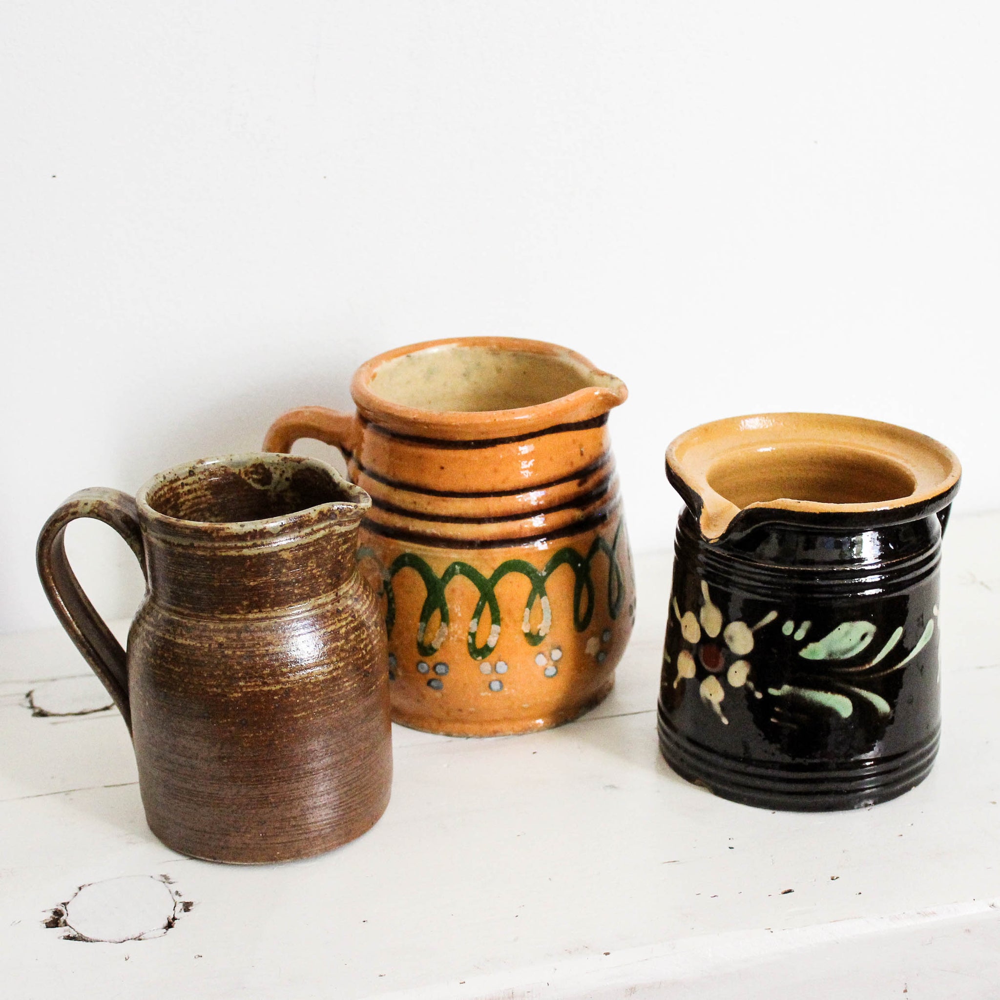 Pêle-mêle de pichets anciens et artisanaux en grès, avec anses et bec verseur, vendus séparément.