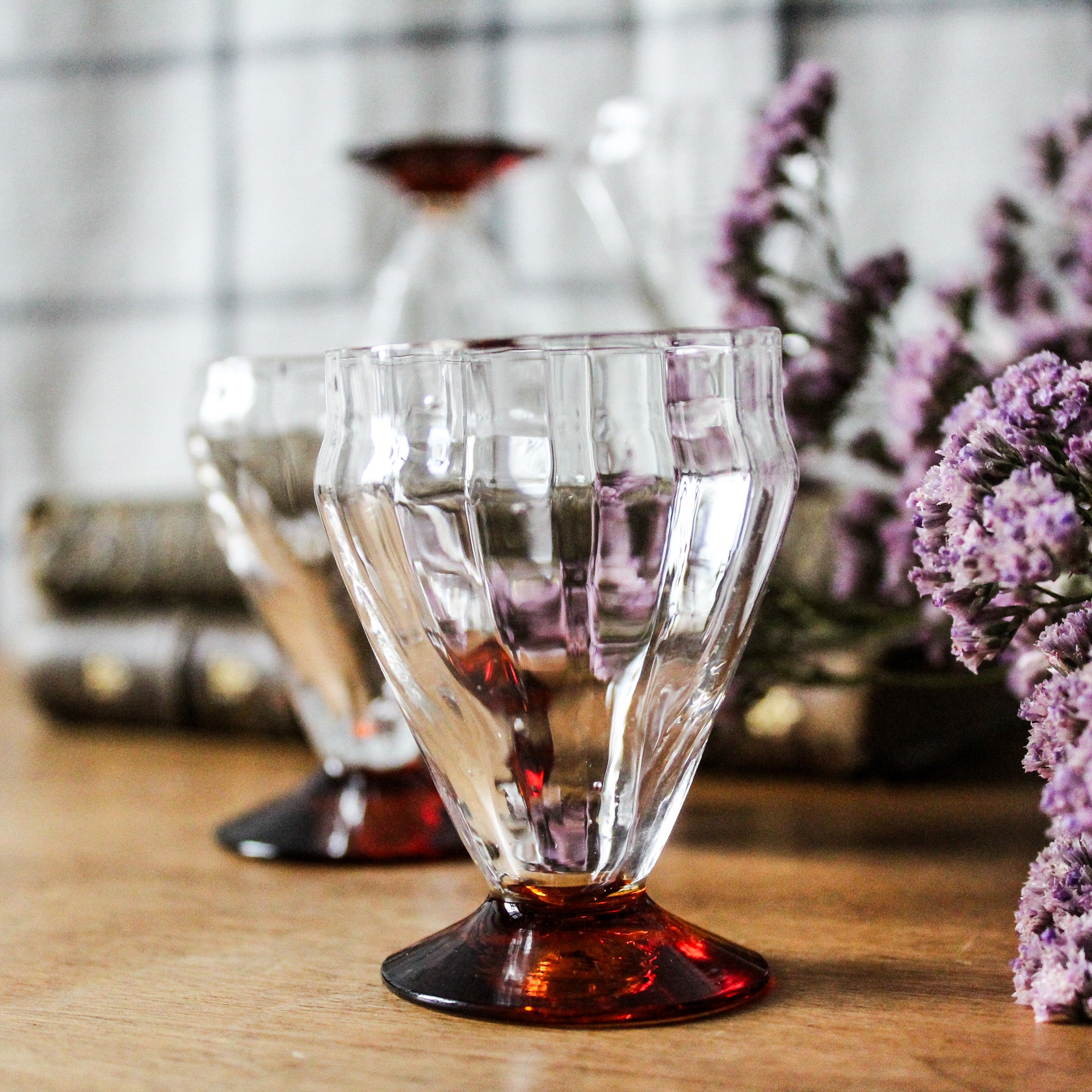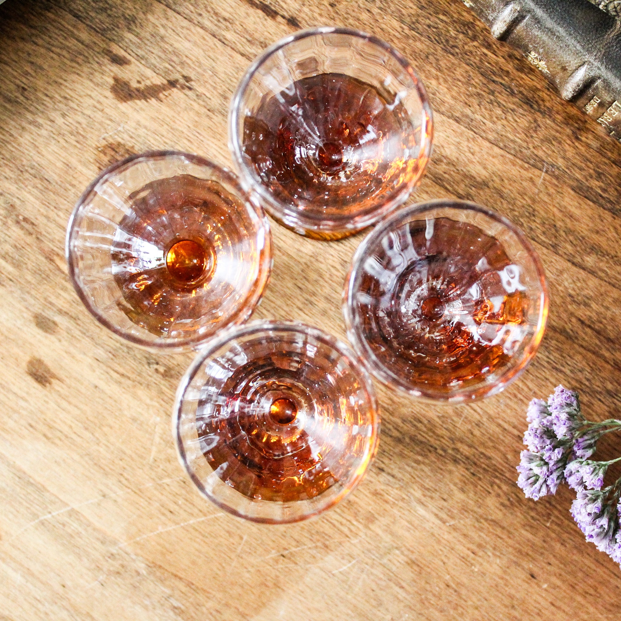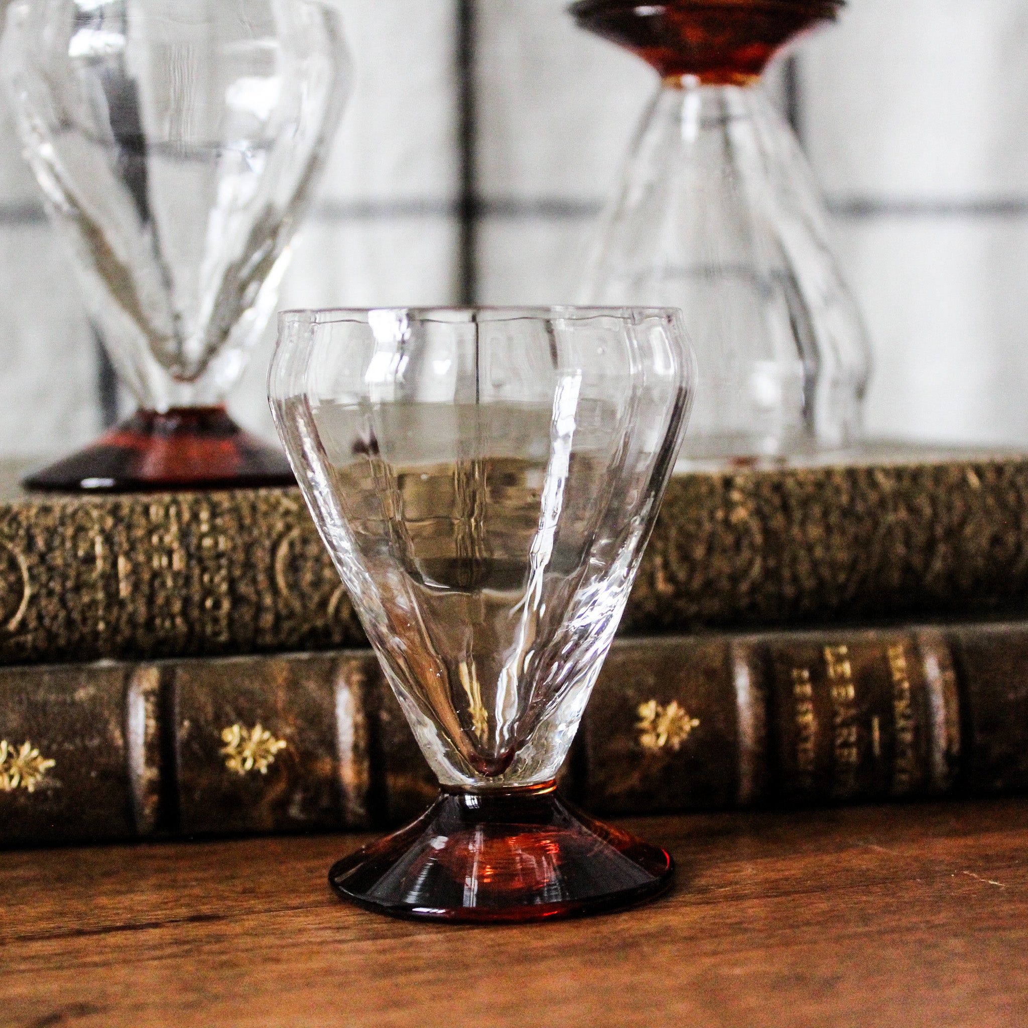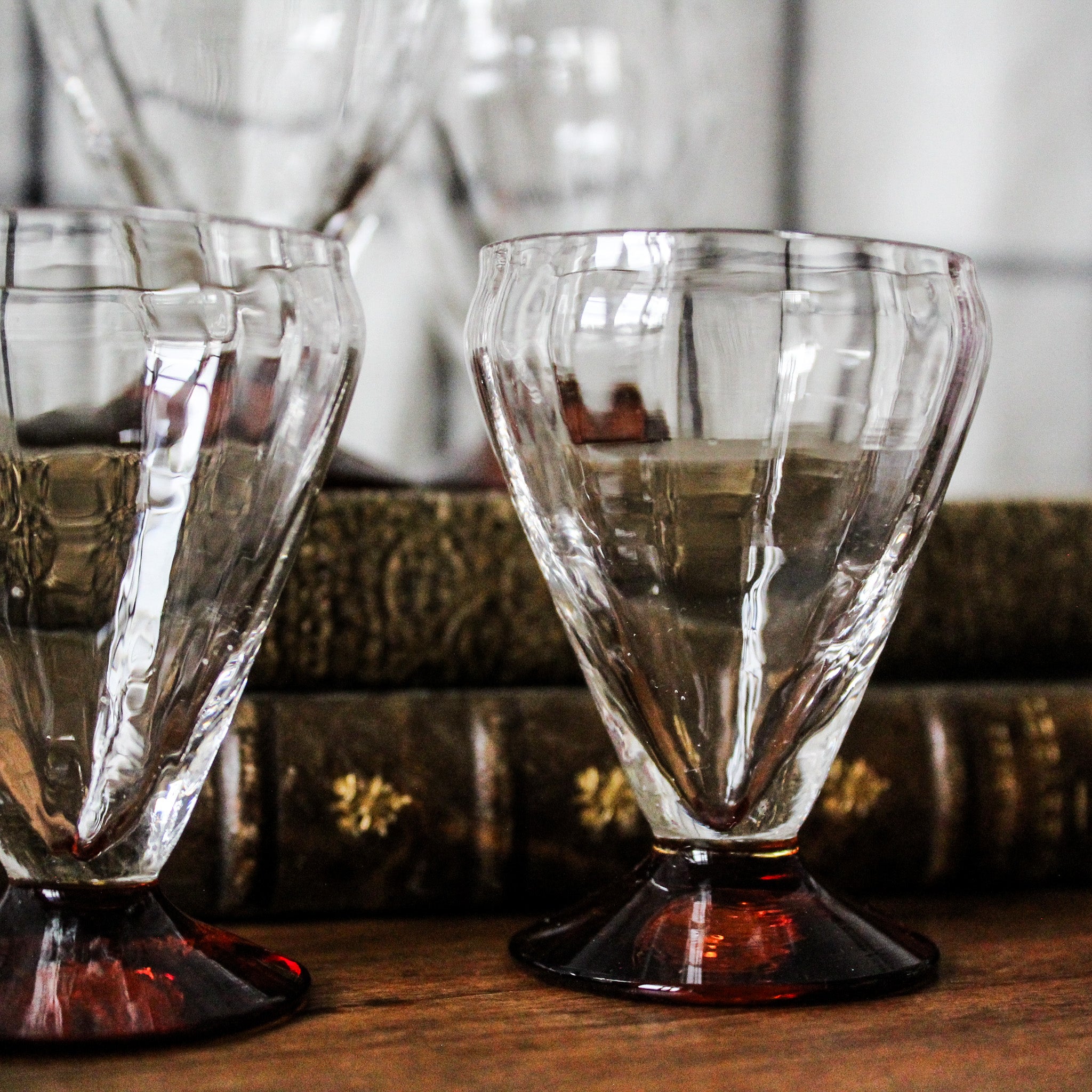 Superbe ensemble de 4 petits verres anciens en cristal, circa 1930, délicats avec un élégant pied orangé. L'irrégularité des formes, les marques du pontil et la présence de petites bulles entre autres détails, témoignent de leur confection en verre soufflé à la bouche.