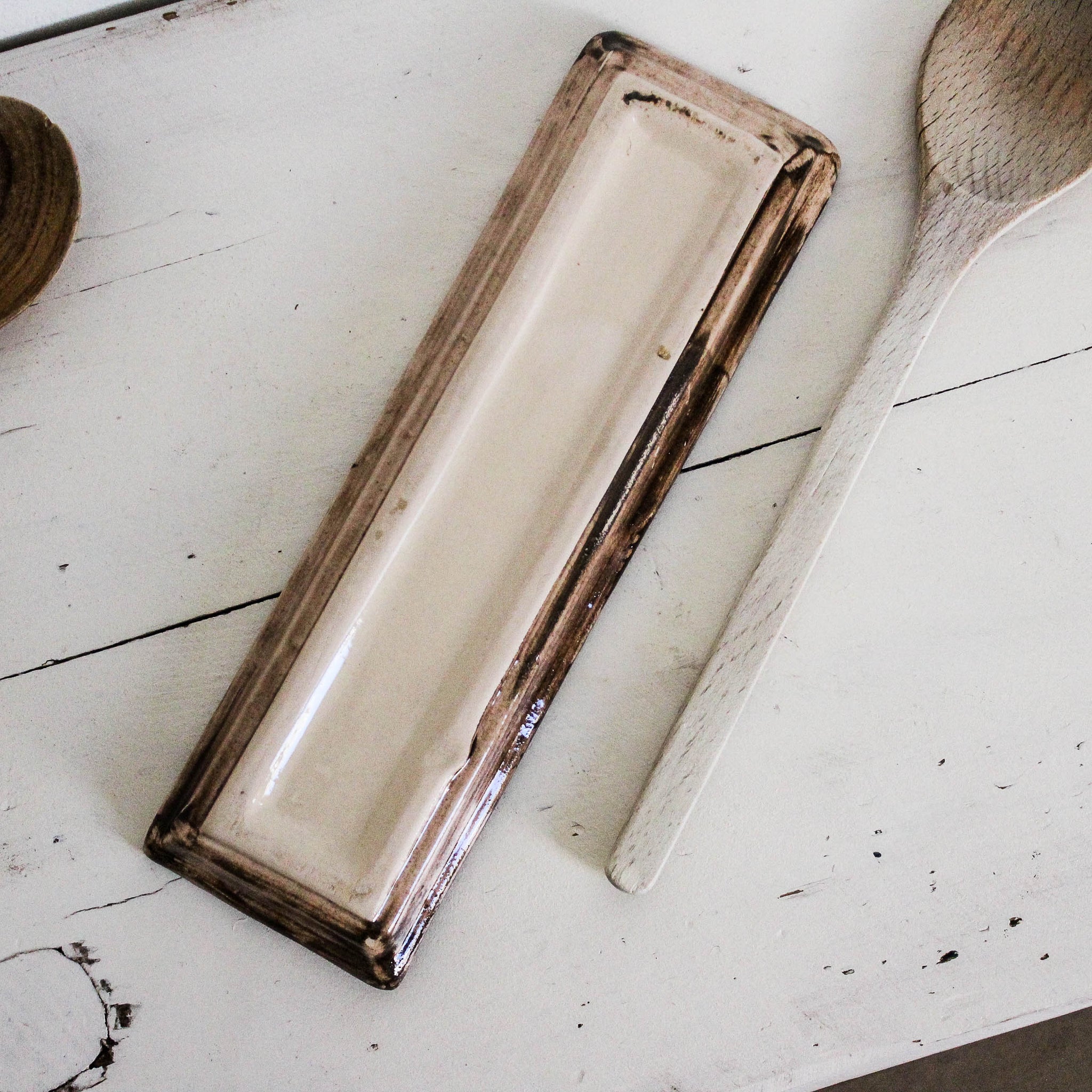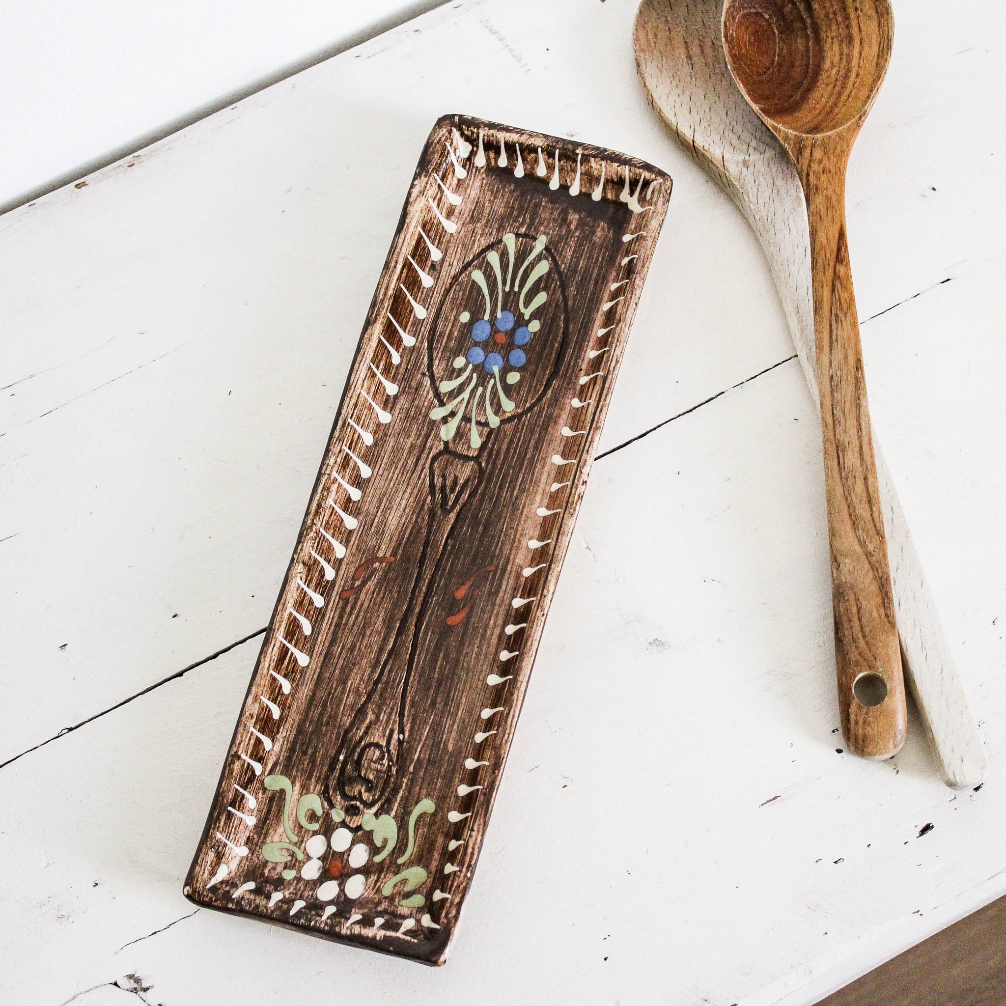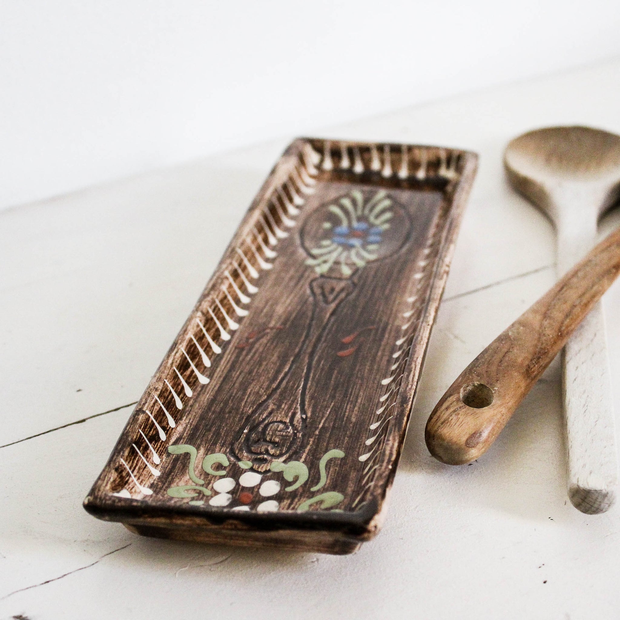 Joli repose cuillère rectangulaire vintage. Poterie artisanale alsacienne, peinte à la main.