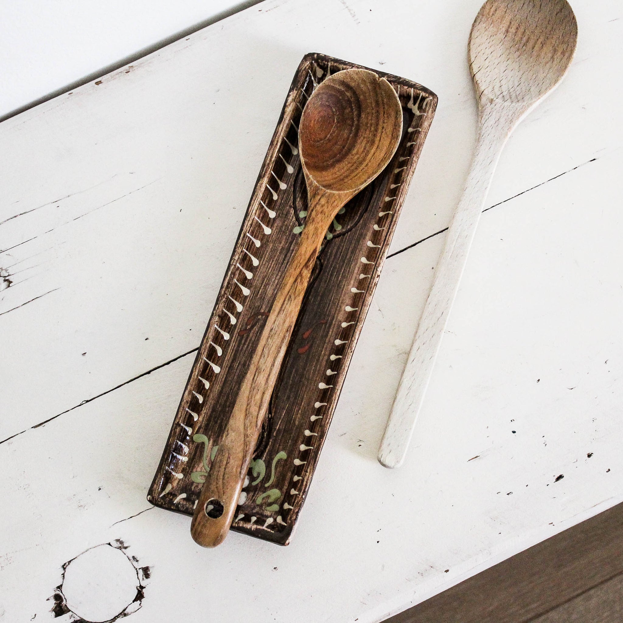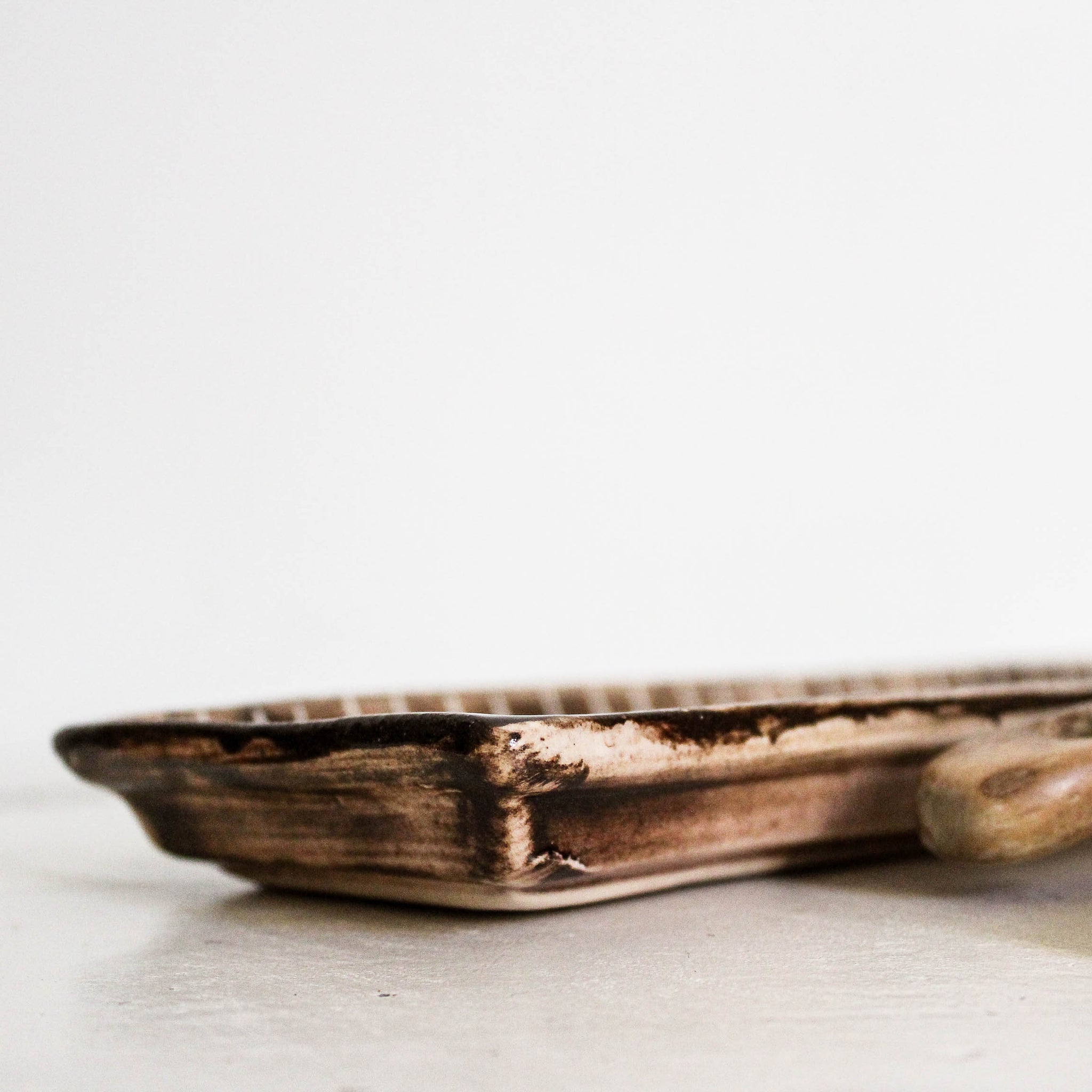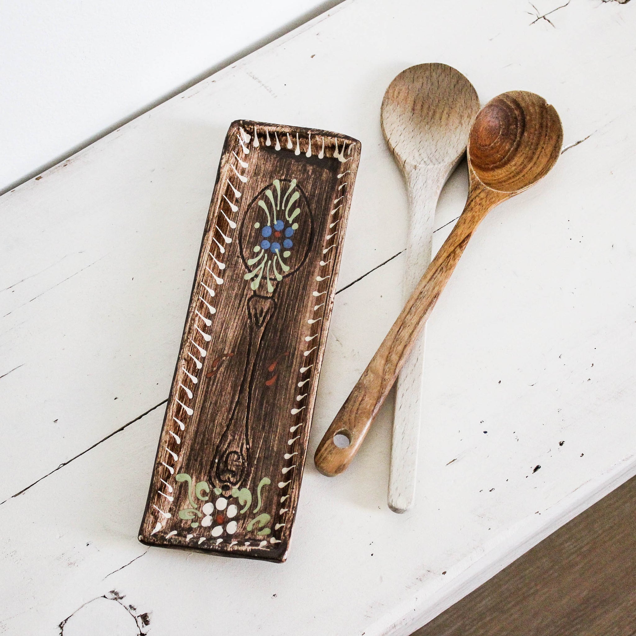 Joli repose cuillère rectangulaire vintage. Poterie artisanale alsacienne, peinte à la main.