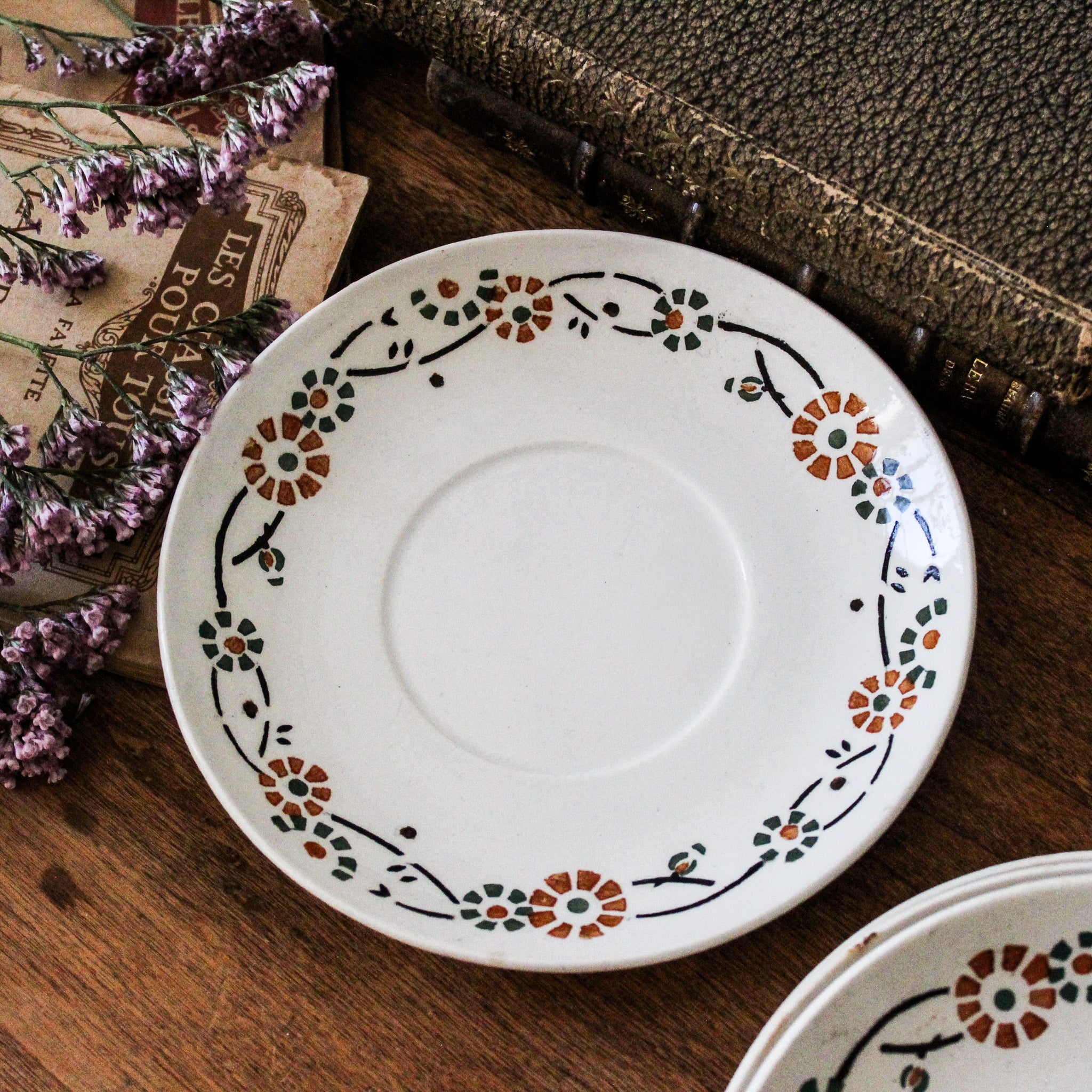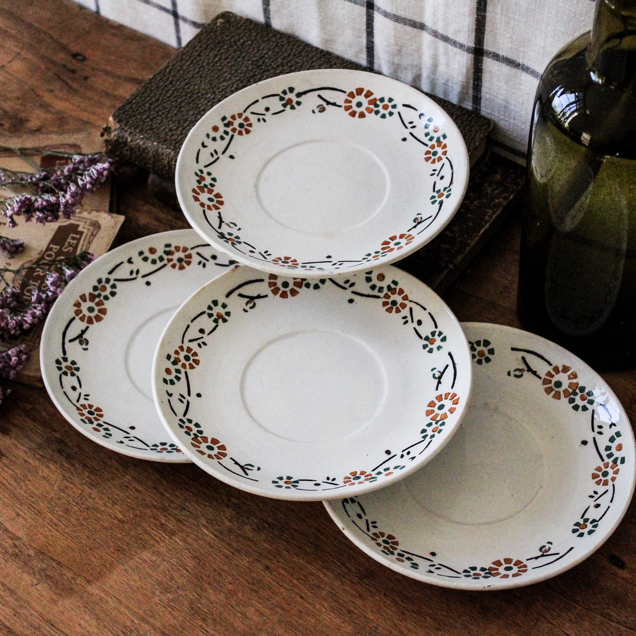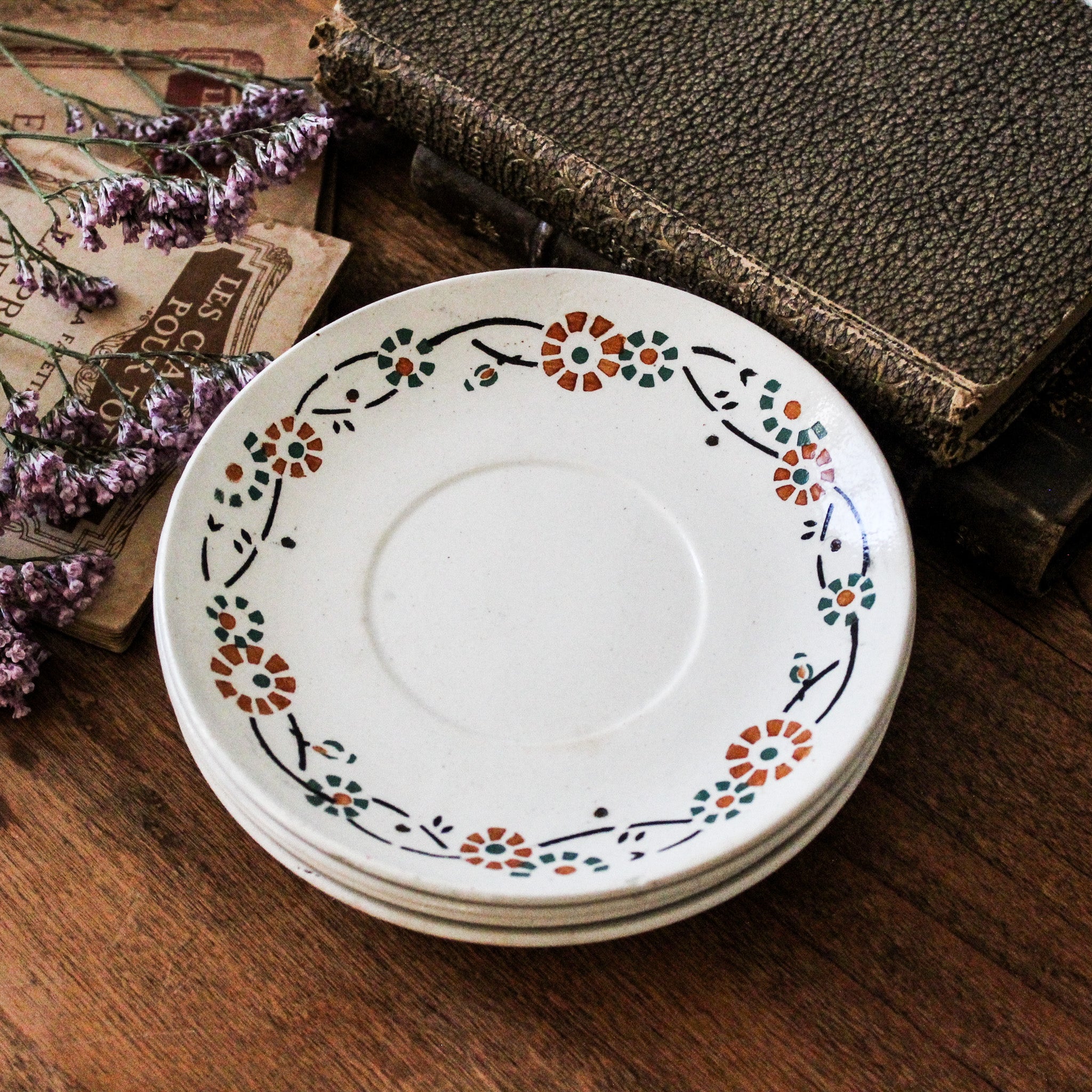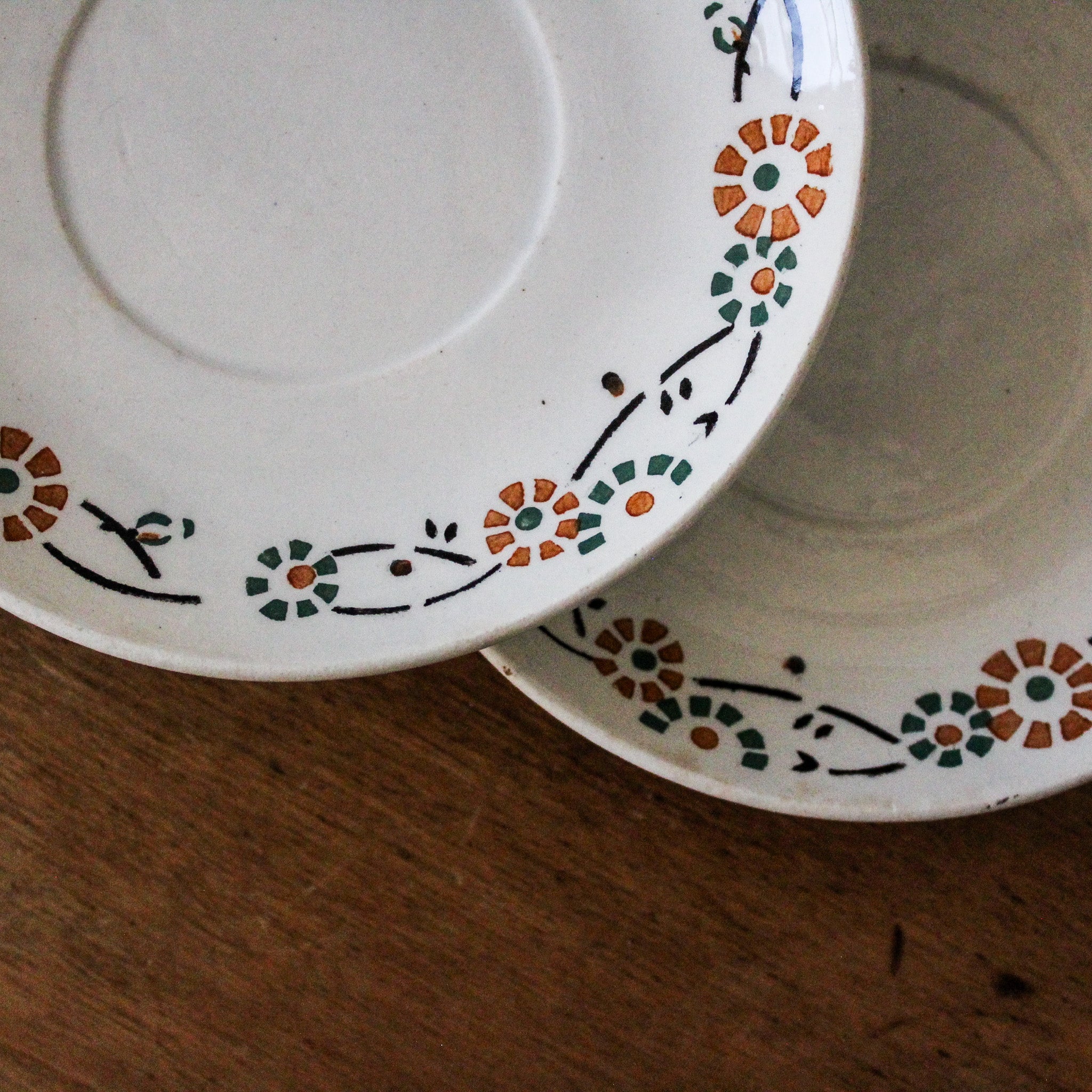 Ensemble de 4 sous-tasses anciennes, en porcelaine opaque de Gien, décor fleuri orange et vert, modèle 553. Marque au dos employée par la faïencerie entre 1886 et 1938.