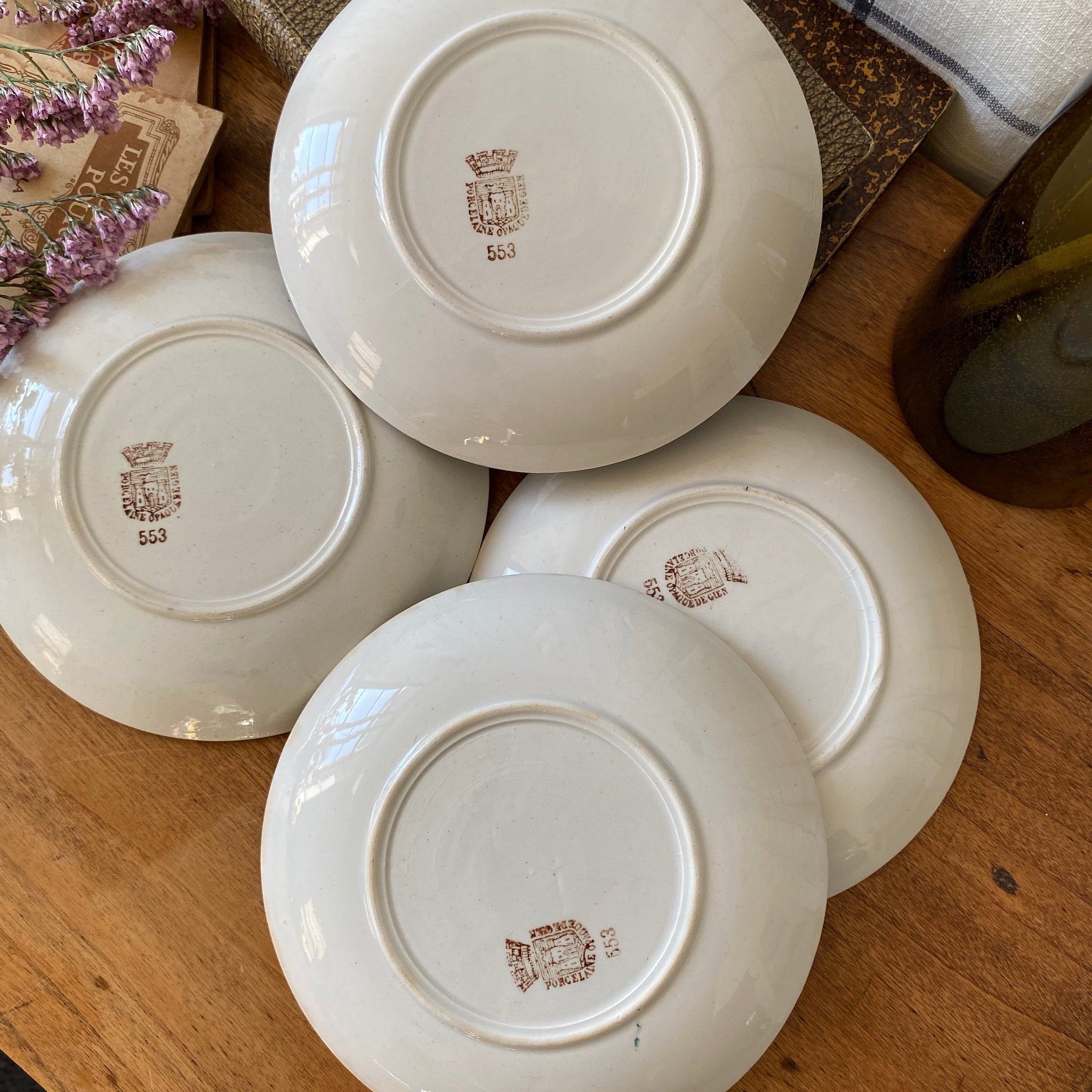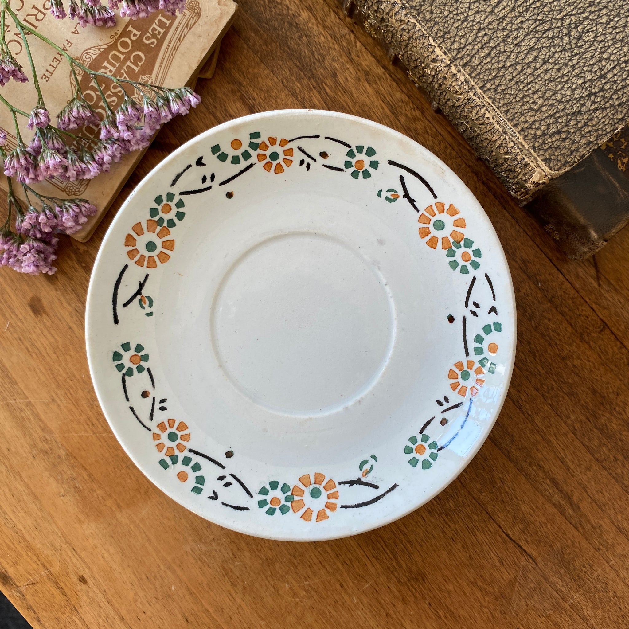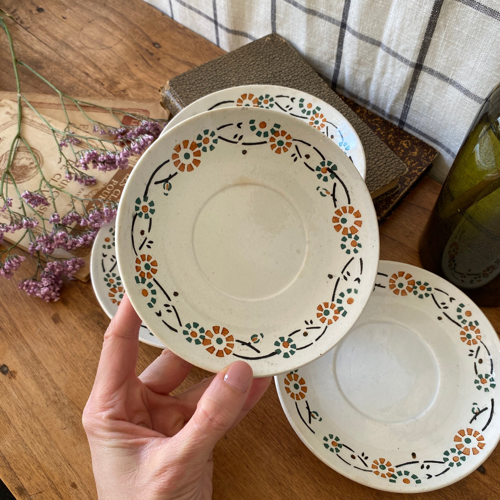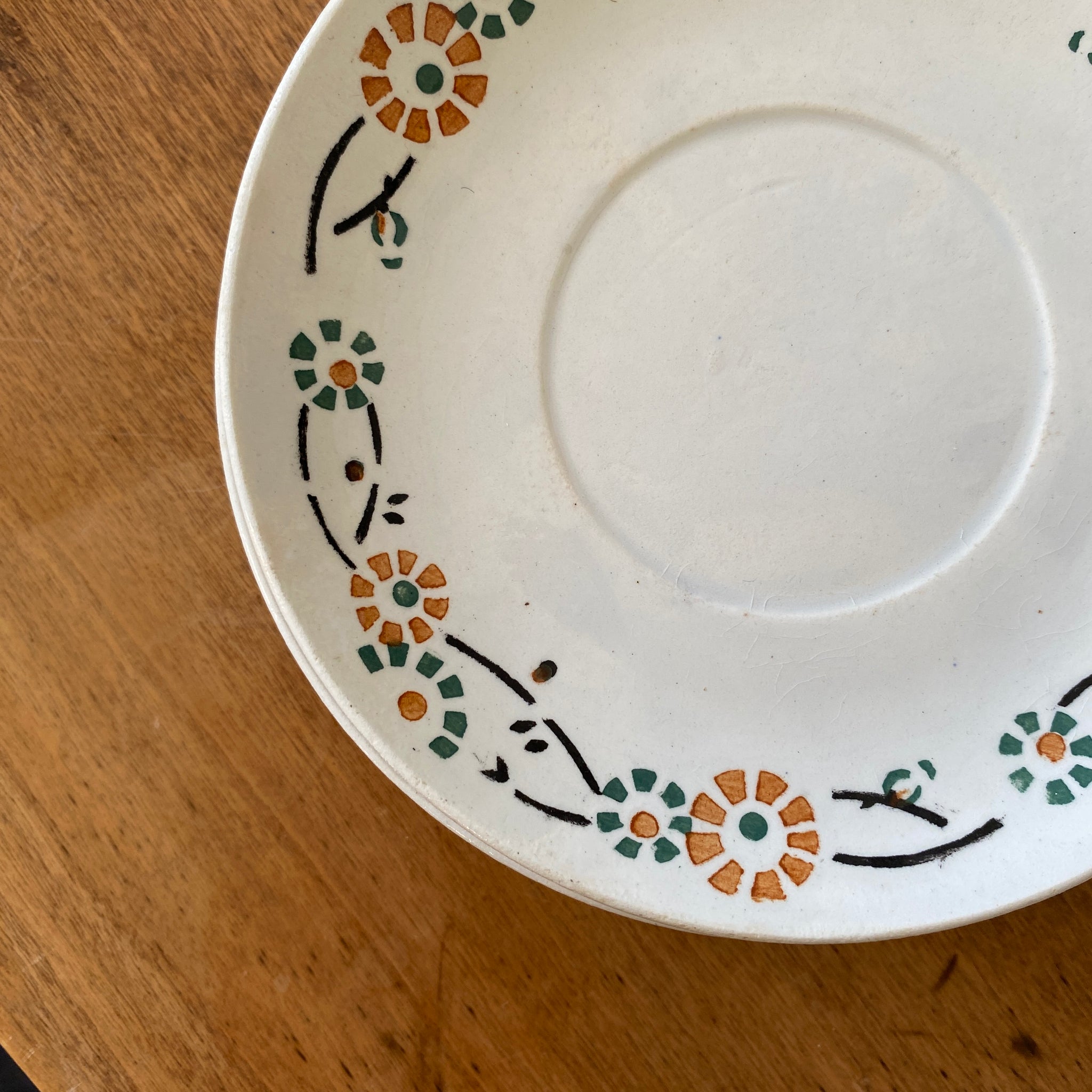 Ensemble de 4 sous-tasses anciennes, en porcelaine opaque de Gien, décor fleuri orange et vert, modèle 553. Marque au dos employée par la faïencerie entre 1886 et 1938.