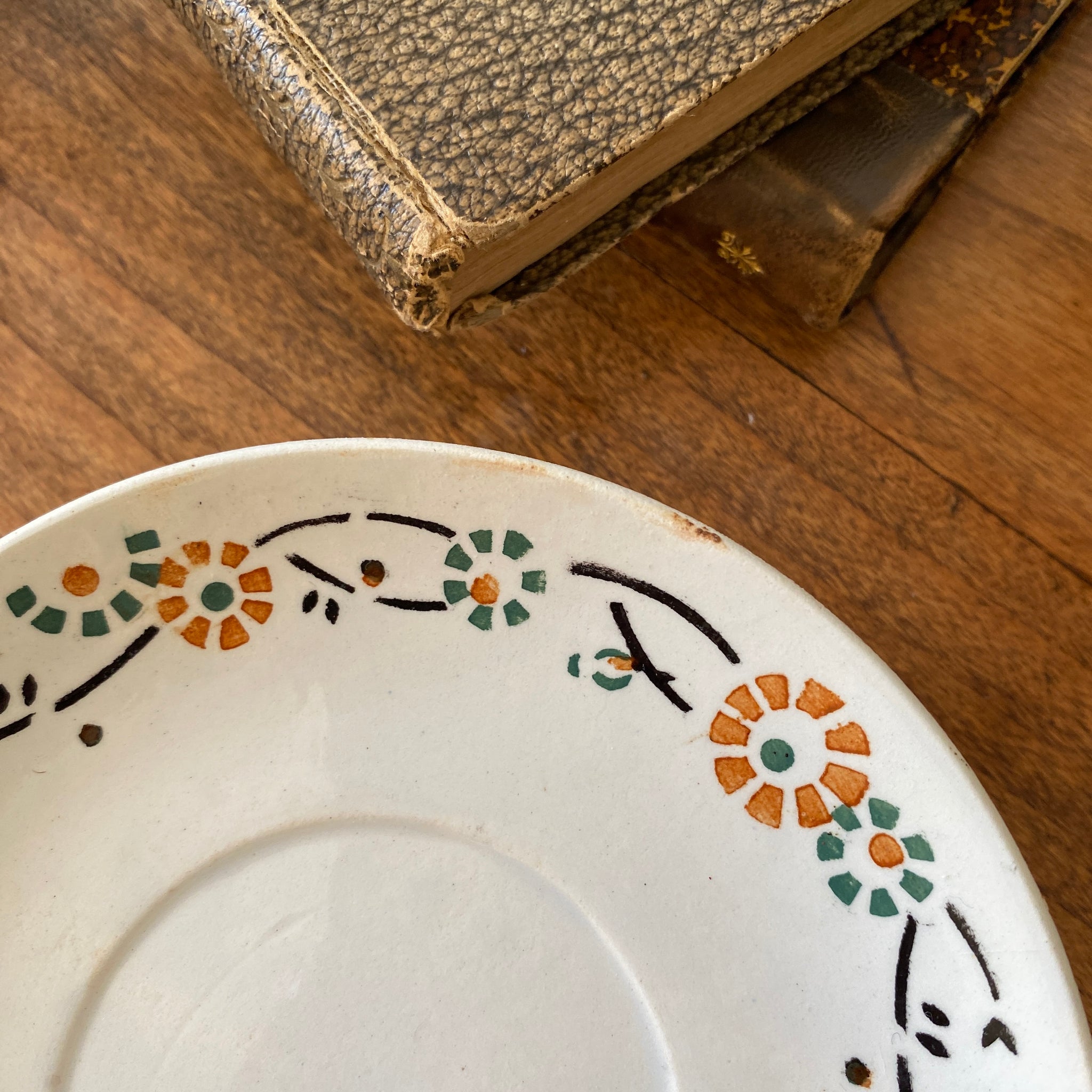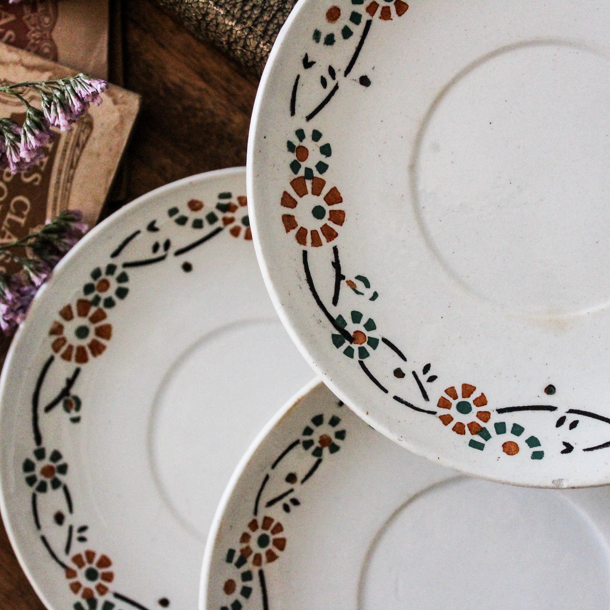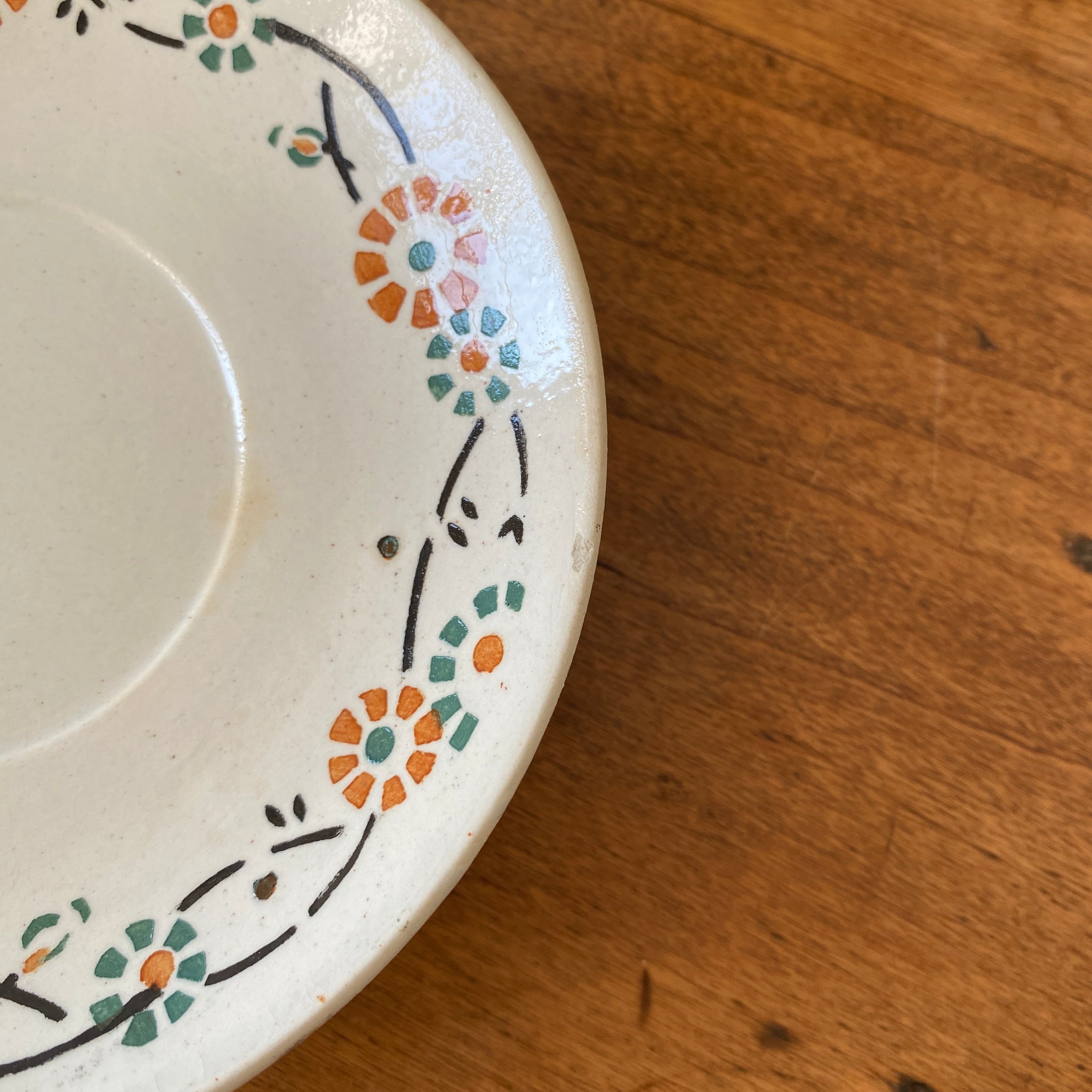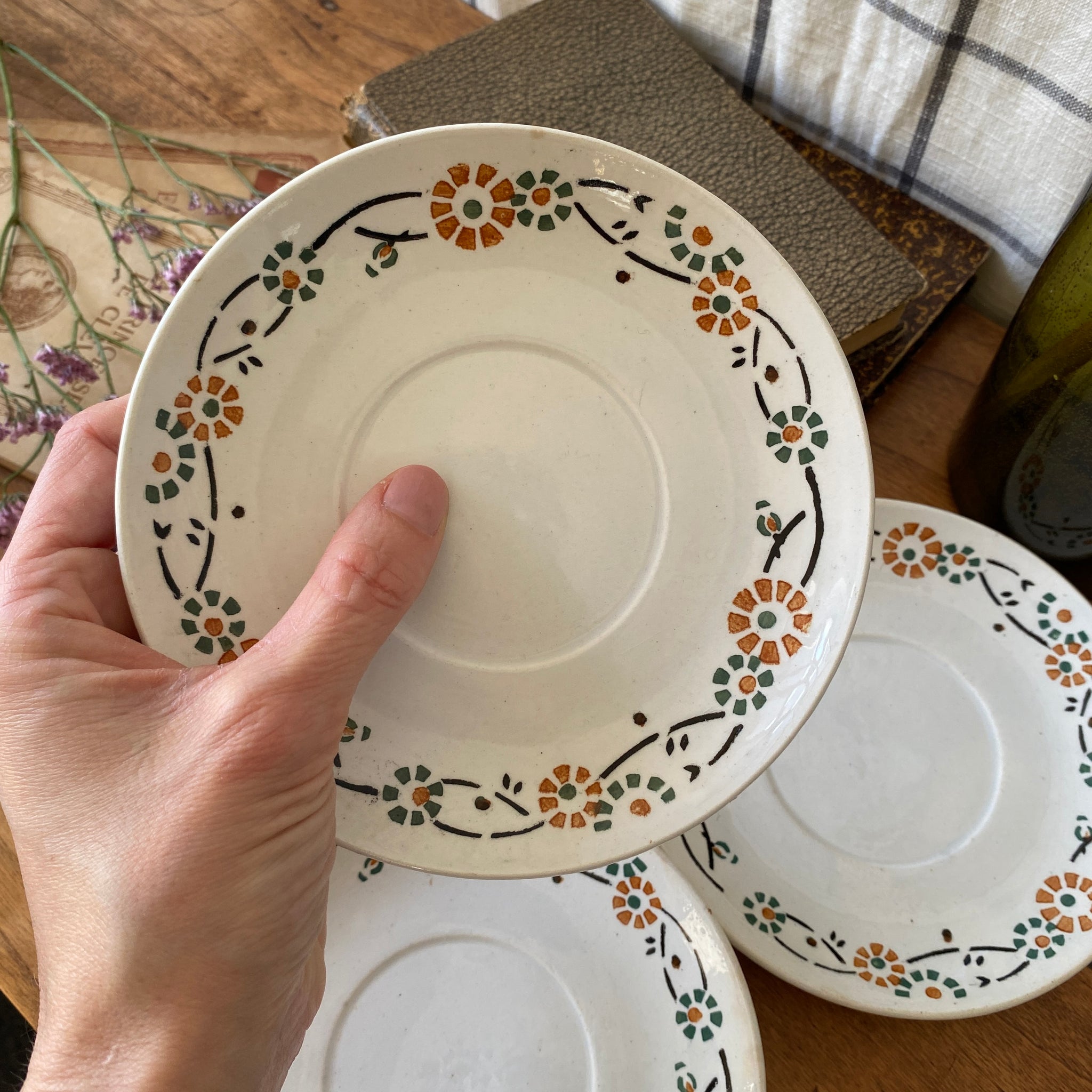 Ensemble de 4 sous-tasses anciennes, en porcelaine opaque de Gien, décor fleuri orange et vert, modèle 553. Marque au dos employée par la faïencerie entre 1886 et 1938.