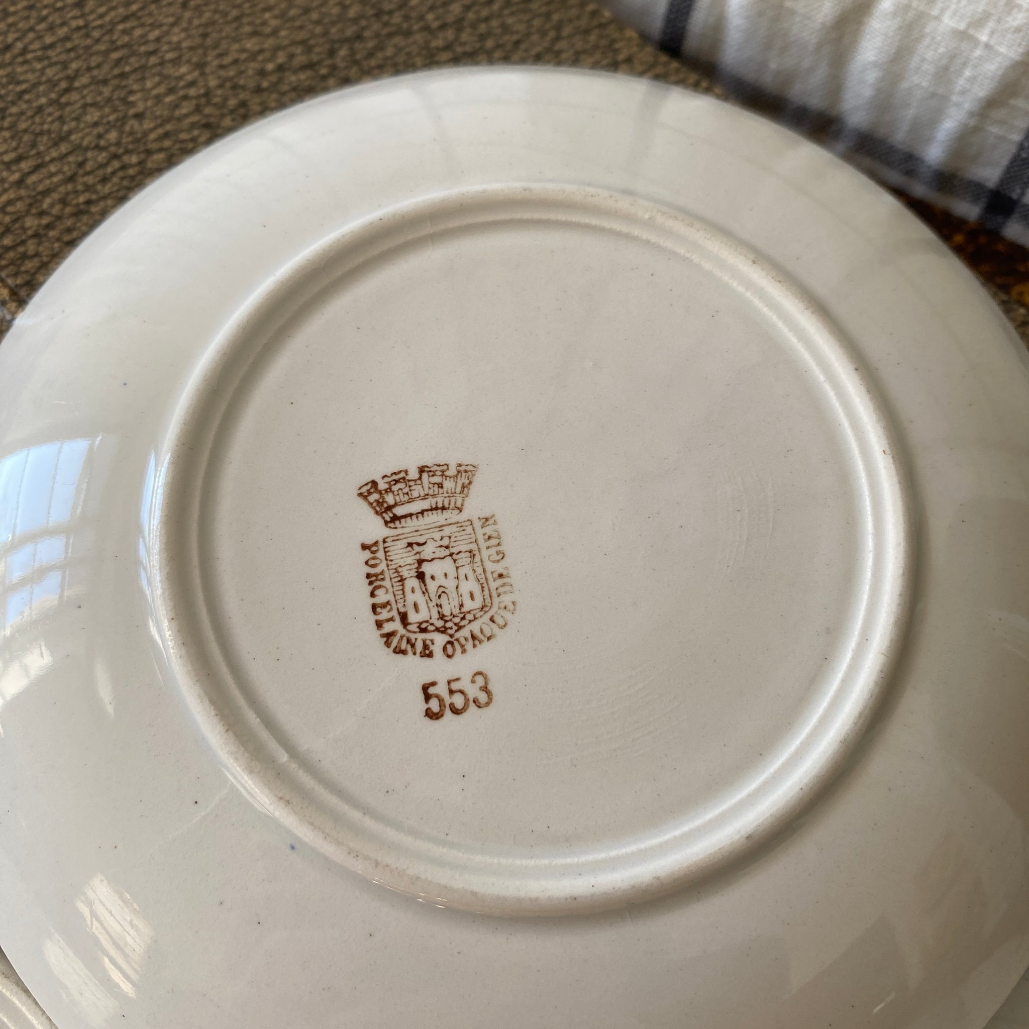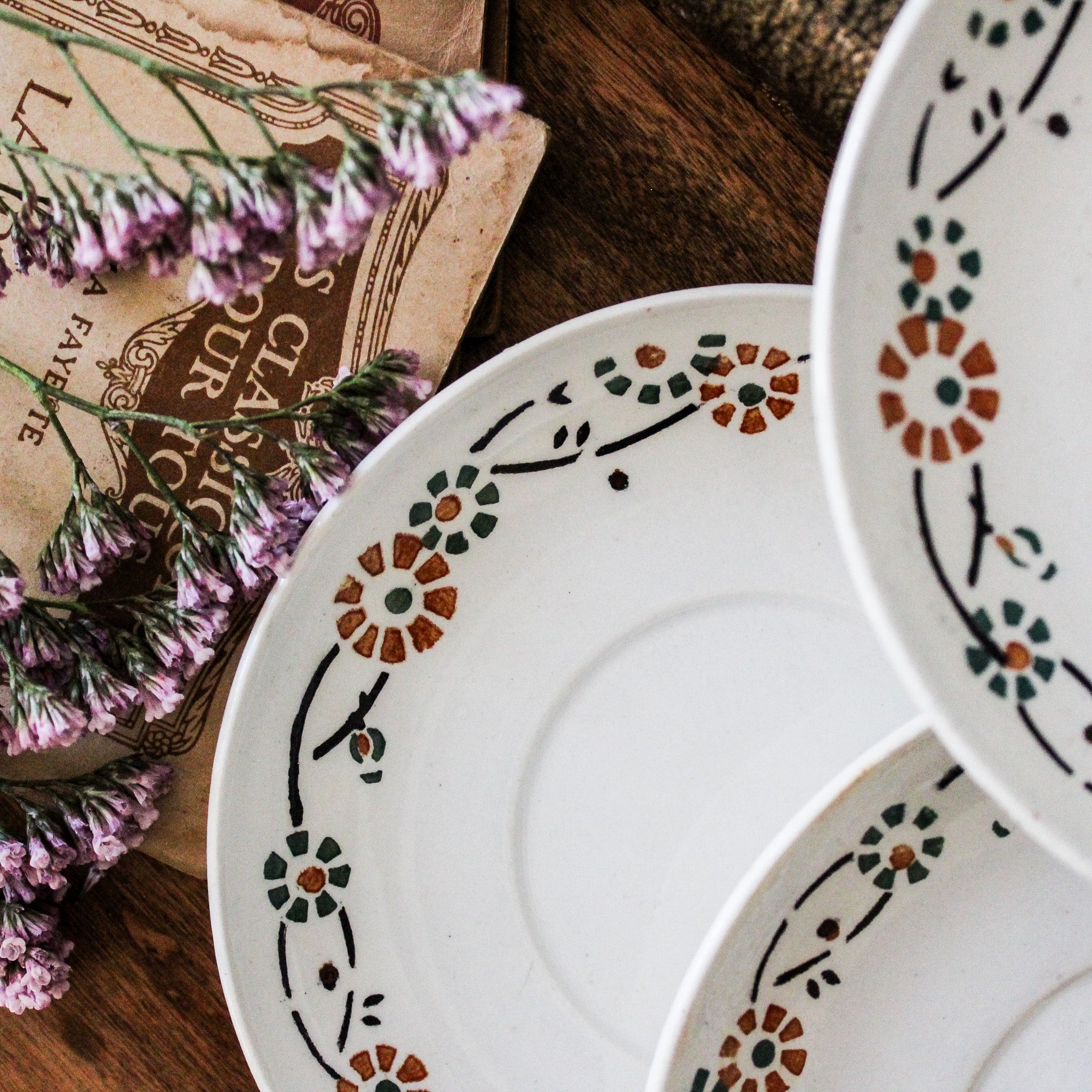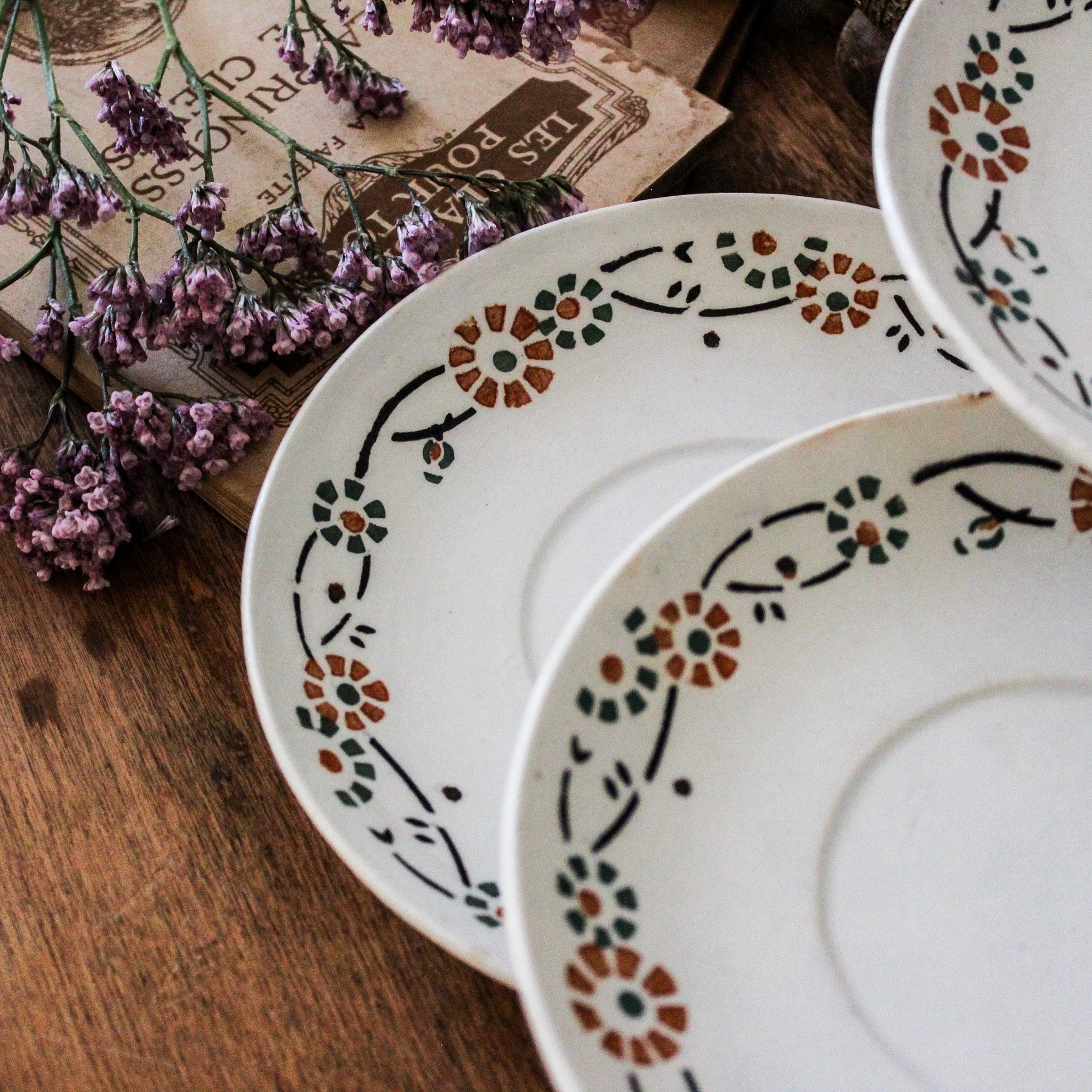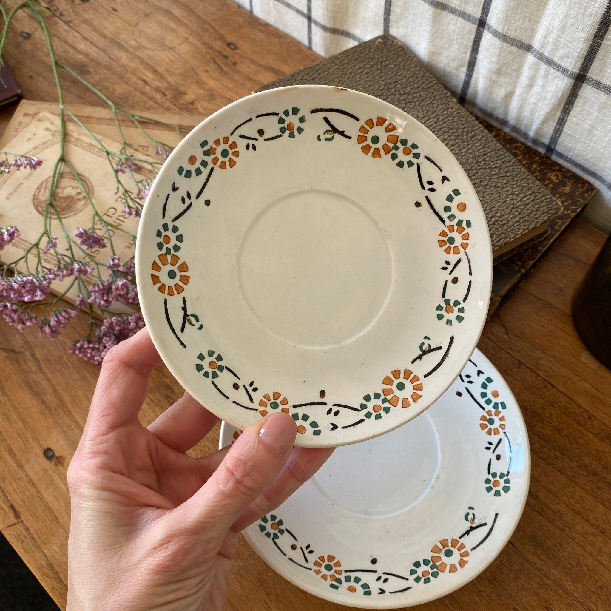 Ensemble de 4 sous-tasses anciennes, en porcelaine opaque de Gien, décor fleuri orange et vert, modèle 553. Marque au dos employée par la faïencerie entre 1886 et 1938.