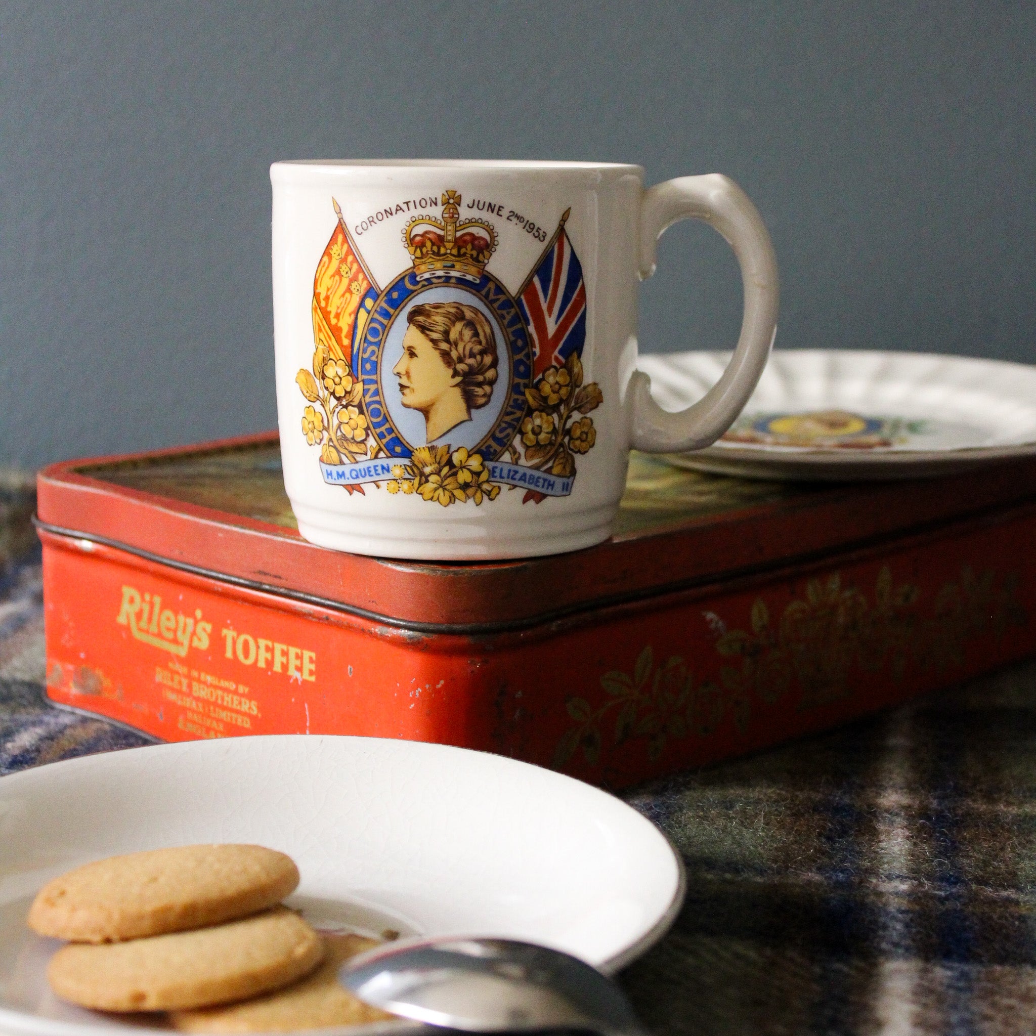 Mug royal en céramique en parfait état, représentant Queen Elizabeth II, édité à l'occasion de son couronnement en 1953.