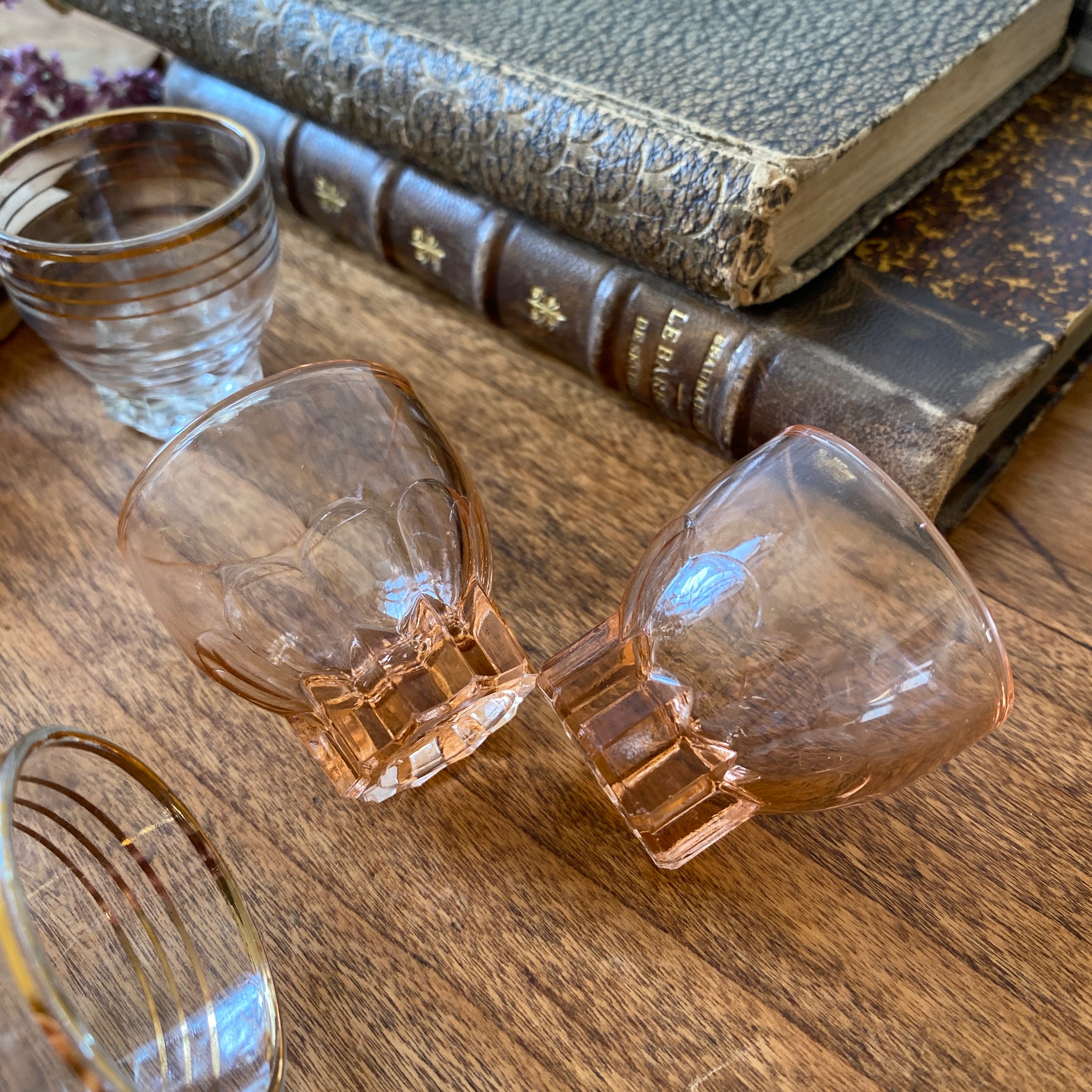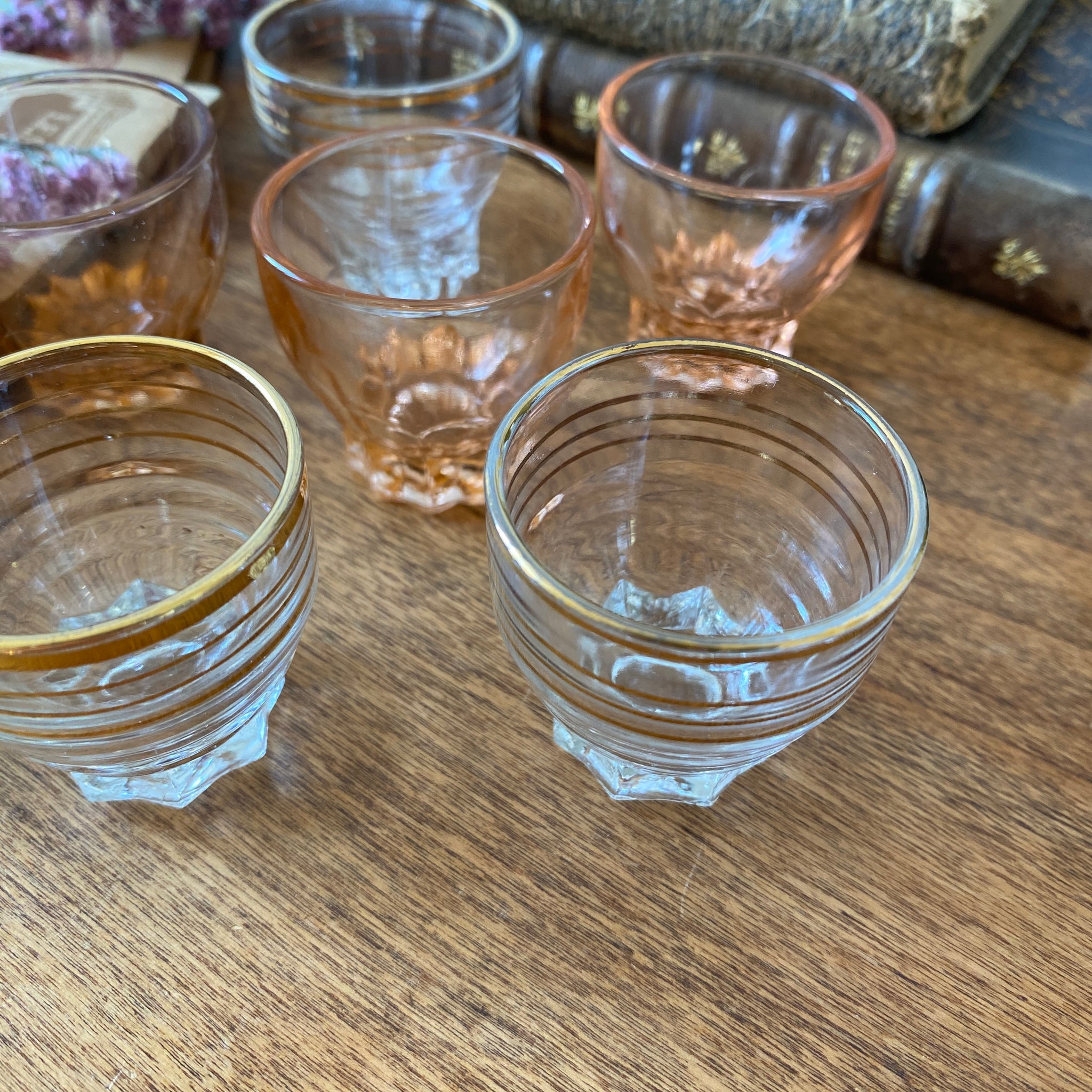 Ensemble composé de 3 verres Rosaline Arcoroc et 3 autres en verre transparent décorés de liserés dorés.